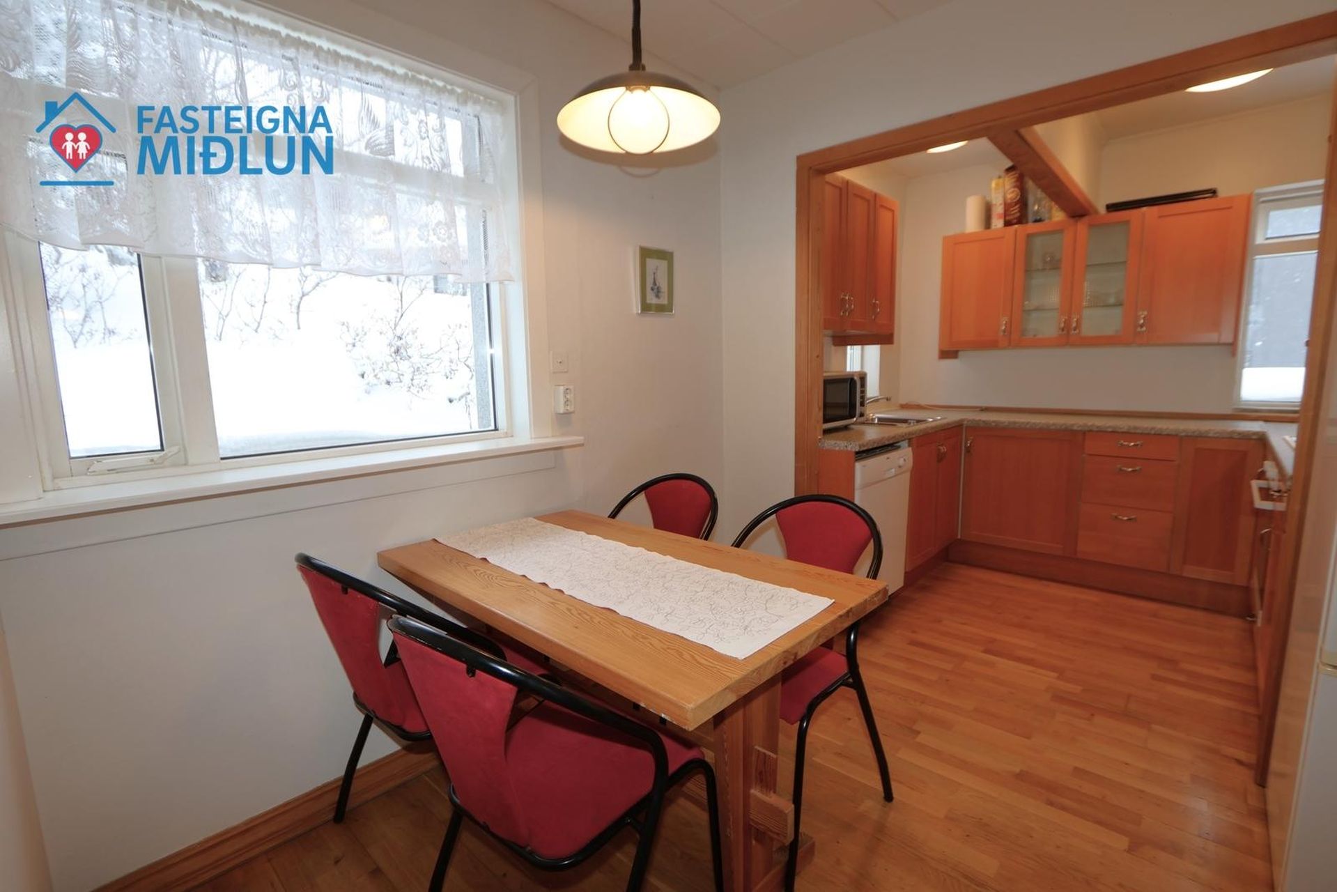 Eldhús: er með eikar innréttingu með efri og neðri skápum. Sérborðkrókur er fyrir eldhúsborð. Parket er á gólfi.