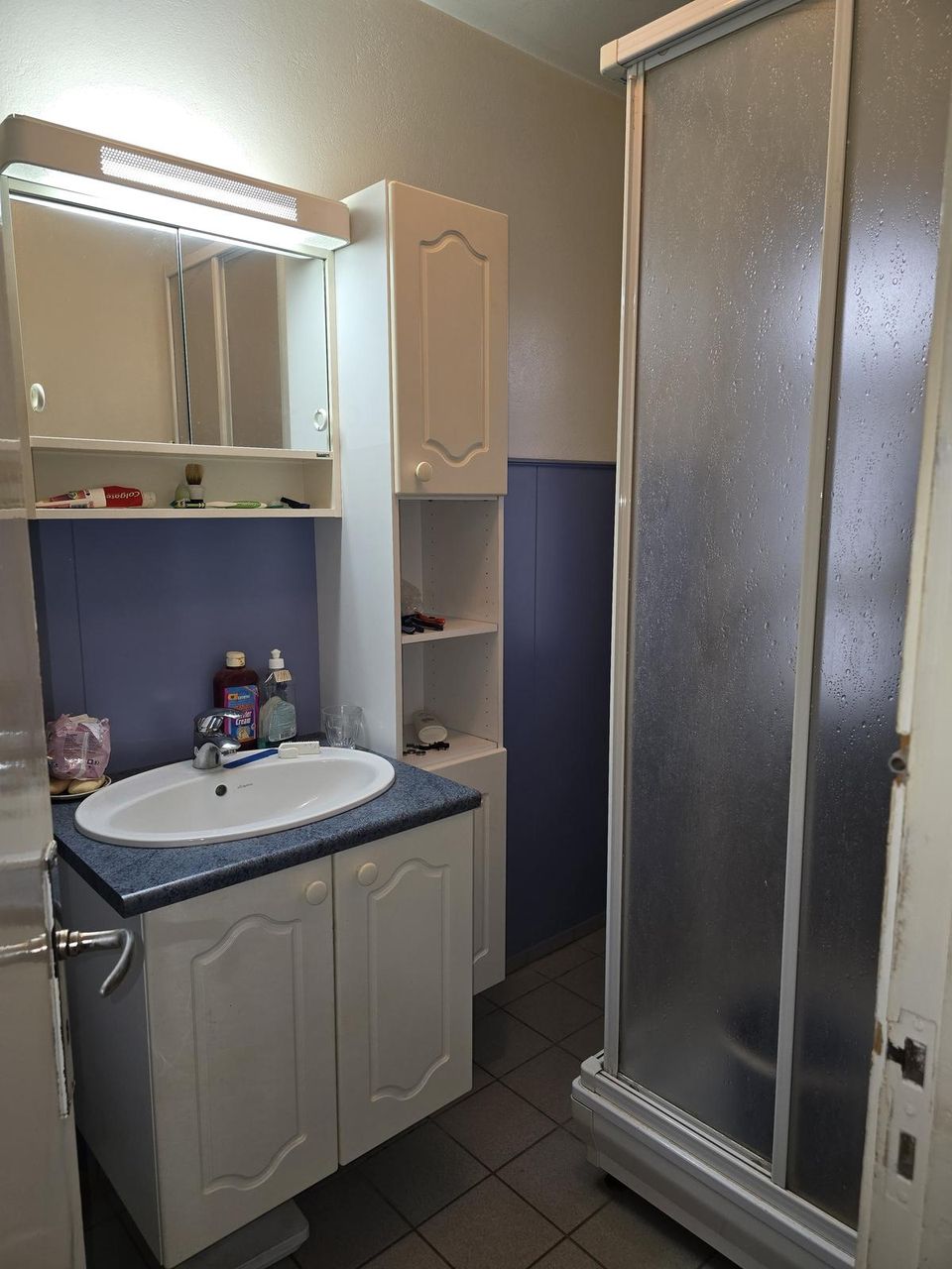 Baðherbergi er flísalagt, hvít innrétting við vask og sturtuklefi.