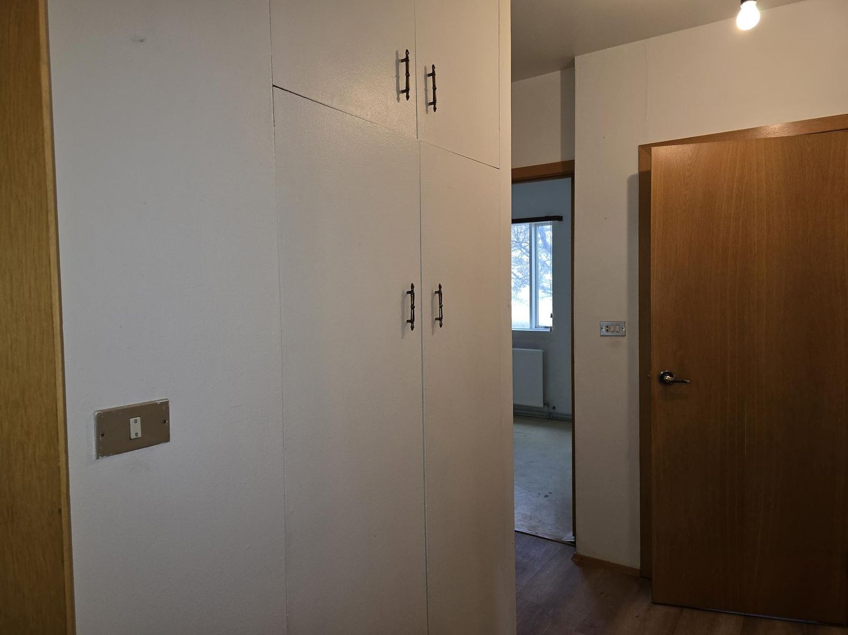 Frá forstofu er komið á parketlagðan gang. Skápar eru við ganginn.