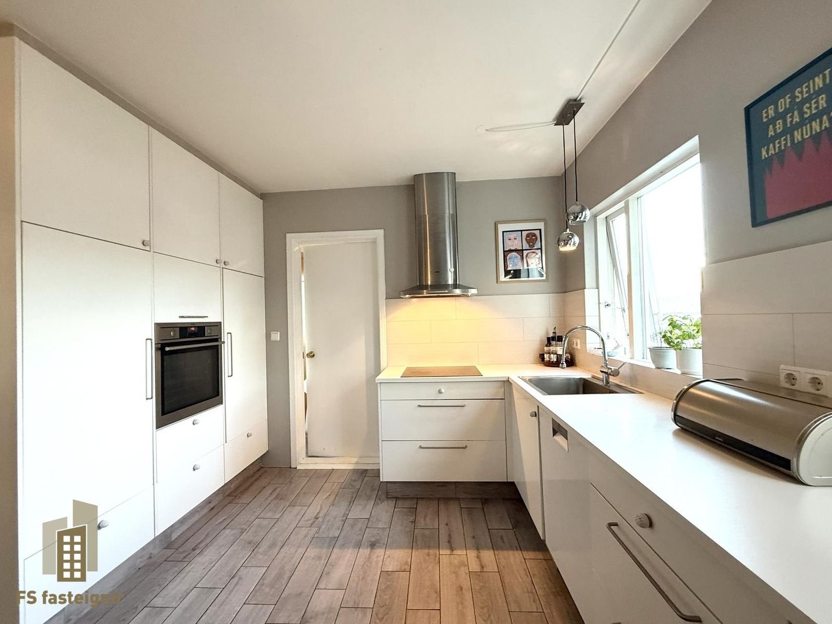 Eldhús er með flísum á gólfi og gólfhita, hvít innrétting, flísar uppá veggi, tengi fyrir uppþvottavél, bakaraofn í vinnuhæð og innbyggðum ísskáp. Gott pláss fyrir eldhúsborð. Fallegir gluggar.