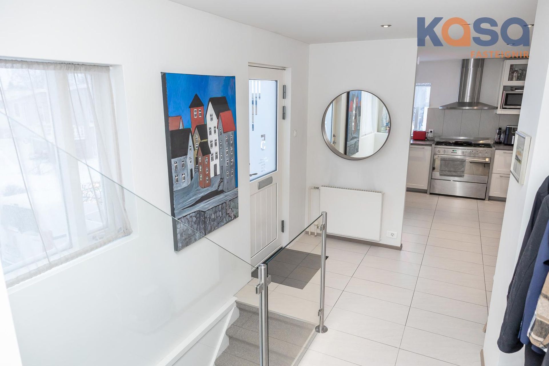 Stigi: Flísalagður stigi og gler/stál handrið.