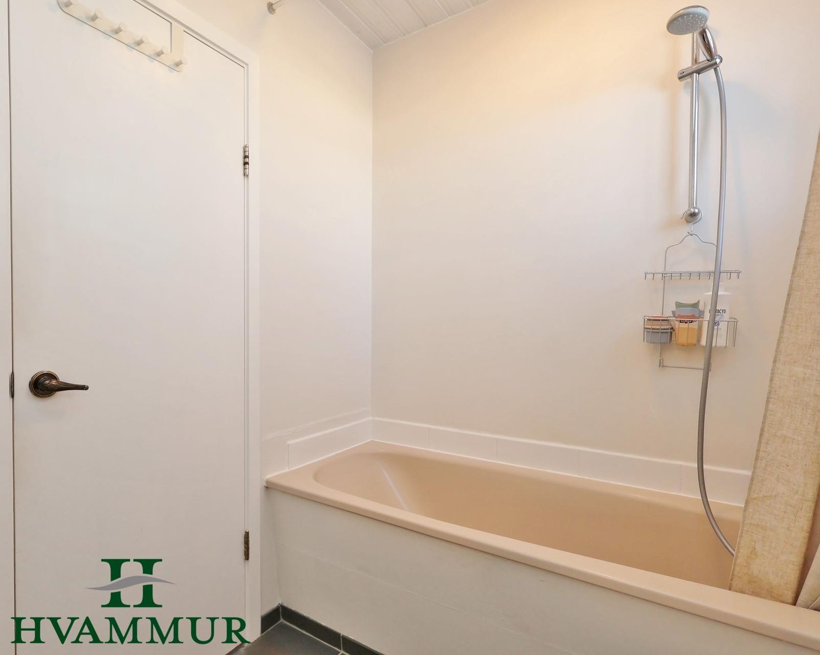 Baðherbergi er flísalagt og þar er baðkar með sturtutækjum og hengi. Opnanlegur gluggi er á baðherberginu.