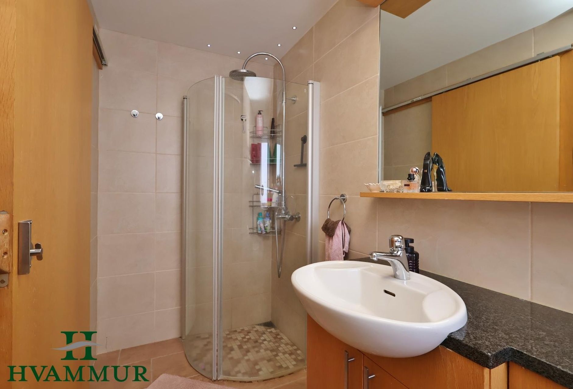 Baðherbergi er flísalagt bæði gólf og veggir, spónlögð eikar innrétting með dökkri stein bekkplötu, upphengt wc, sturta með glerhurðum og opnanlegur gluggi. Rennihurð er inn á baðherbergið.