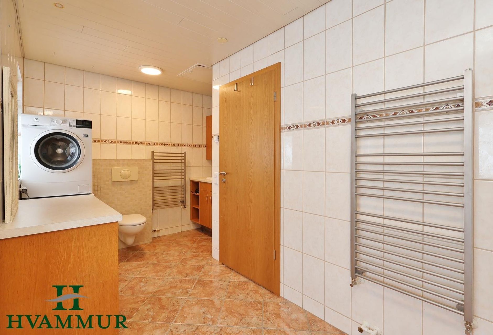 Þvottahús er í sameign með neðri hæðinni og þar eru flísar á gólfi, eldri innrétting og opnanlegur gluggi. Við hliðina á þvottahúsinu er sameiginlegu bakinngangur með flísum á gólfi.