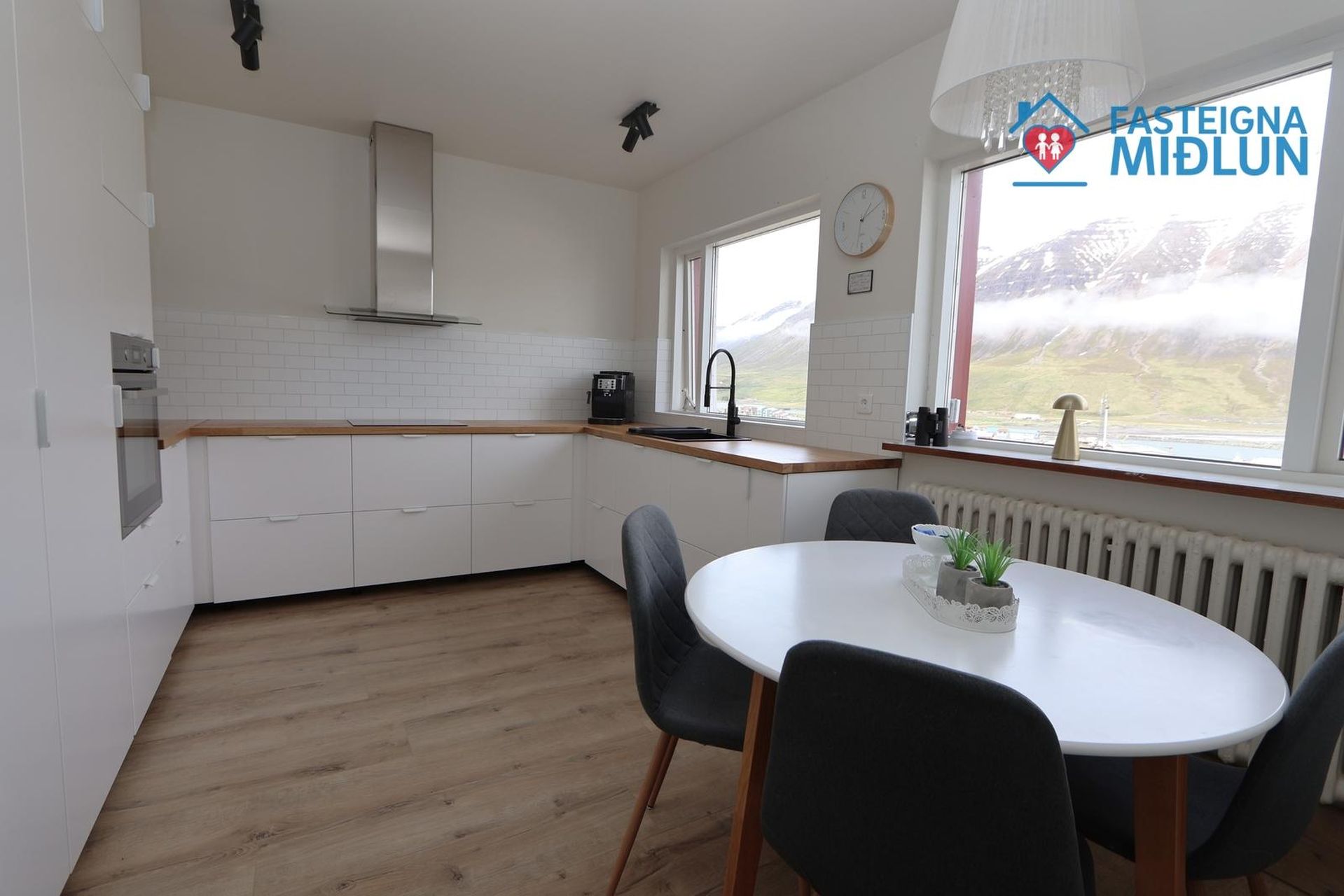 Um er að ræða mikið endurnýjað tvíbýli í hæðum Ólafsfjarðar með miklu útsýni og skjólgóðum palli. Eignin er töluvert uppgerð en eignin var klædd að utan nýlega eða árið 2023. Búið er að skipta um glugga og svalahurð. Pappi var settur á þakið árið 2014. Drenað var bak við hús árið 2023 og sett drenmöl. Skipt var um vatnslagnir árið 2010. Ný útidyrahurð var sett í árið 2024. Eldhús var svo endurnýjað árið 2025. Eignin samanstendur af anddyri, eldhúsi, þvottahúsi, geymslu, baðherbergi, stofu og fjórum svefnherbergjum. Timburpallur er sunnan við eignina og stór grasi lagður garður sem er í sameign.
