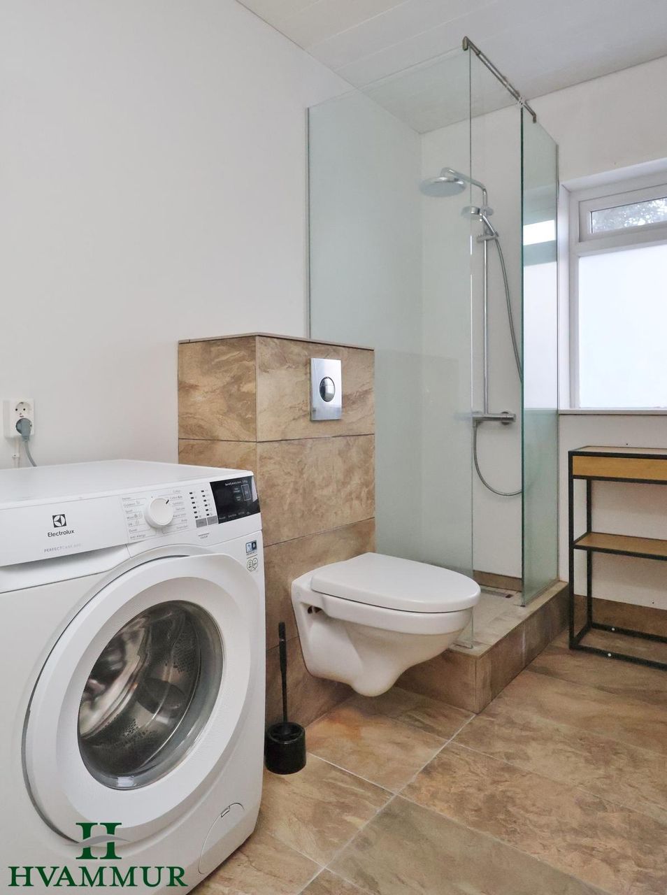 Baðherbergi er með sturtuklefa, upphengdu wc og tengi fyrir þvottavél. Flísar á gólfi og opnanlegur gluggi.