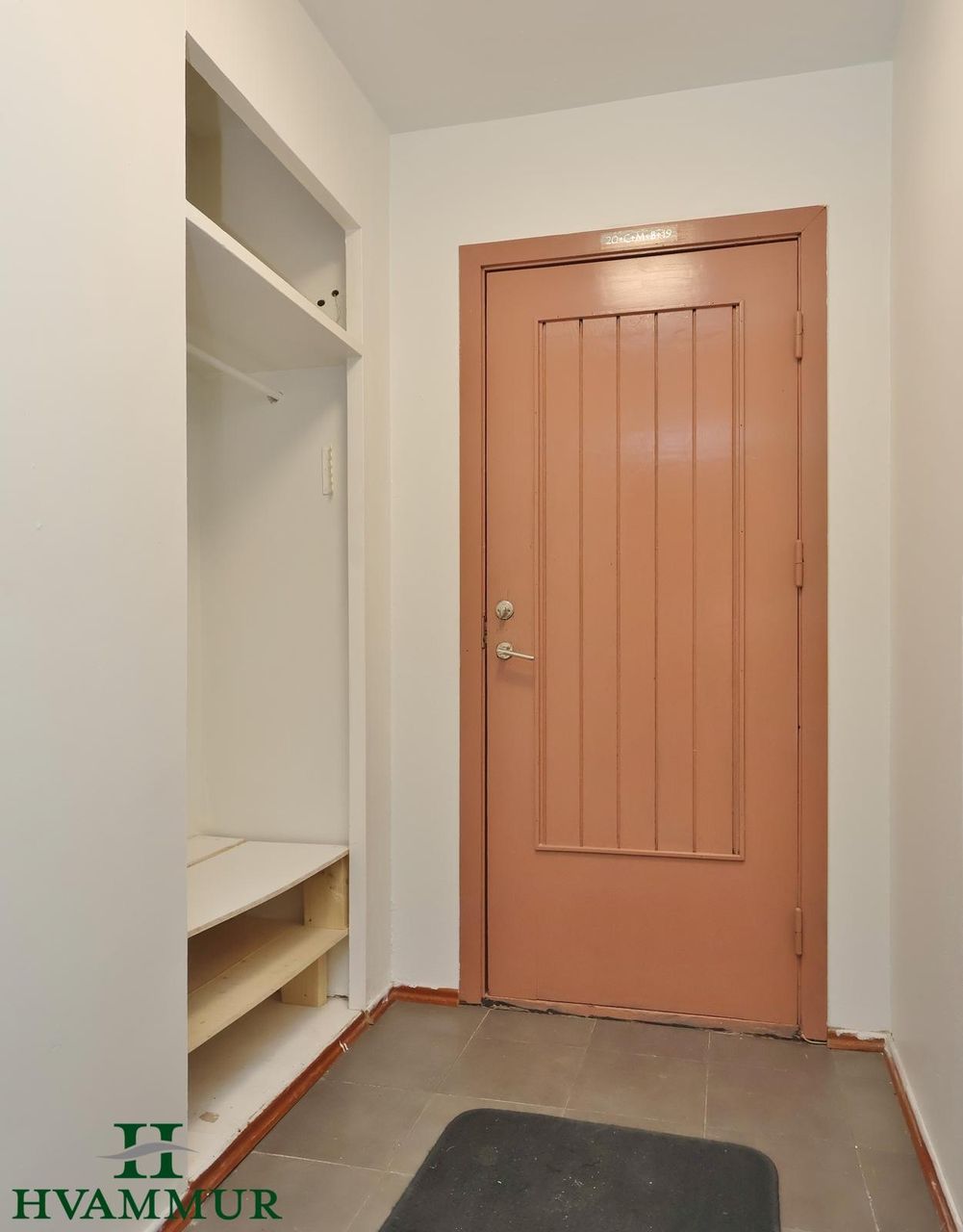 Forstofa er með flísum á gólfi og opnu fatahengi.
