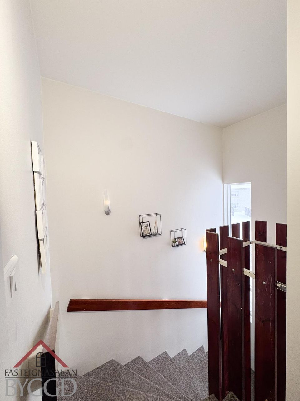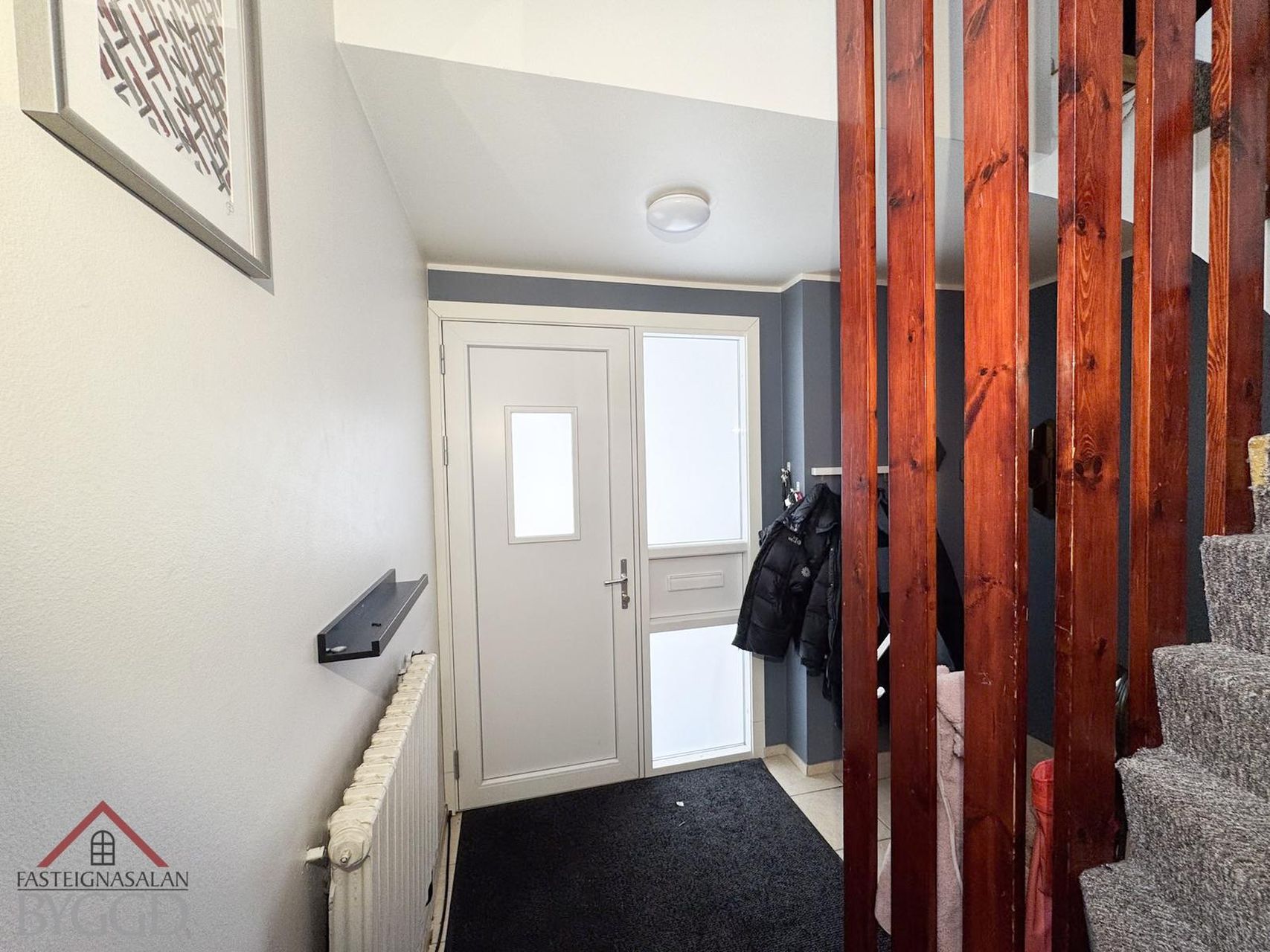 Forstofa er flísum á gólfi, þaðan er gengið upp steyptan og teppalagðan stiga upp á efri hæðina.