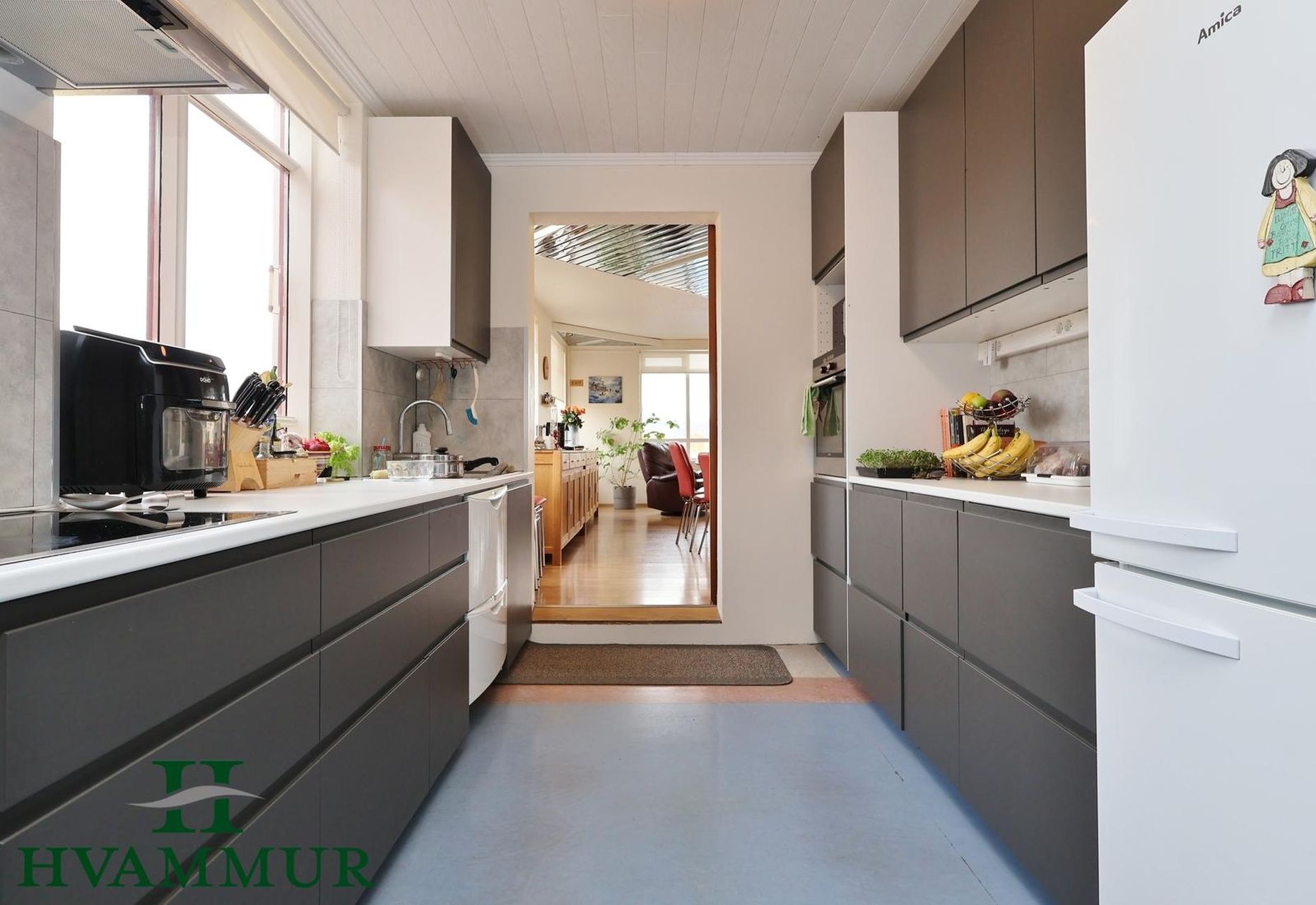Eldhúsið er með dúk á gólfi og þar er nýleg sprautulökkuð innrétting. Opið er úr eldhúsi í þvottahús eða þvottaðstöðu á stigapalli og þar er innrétting í stíl við eldhúsinnréttingu.