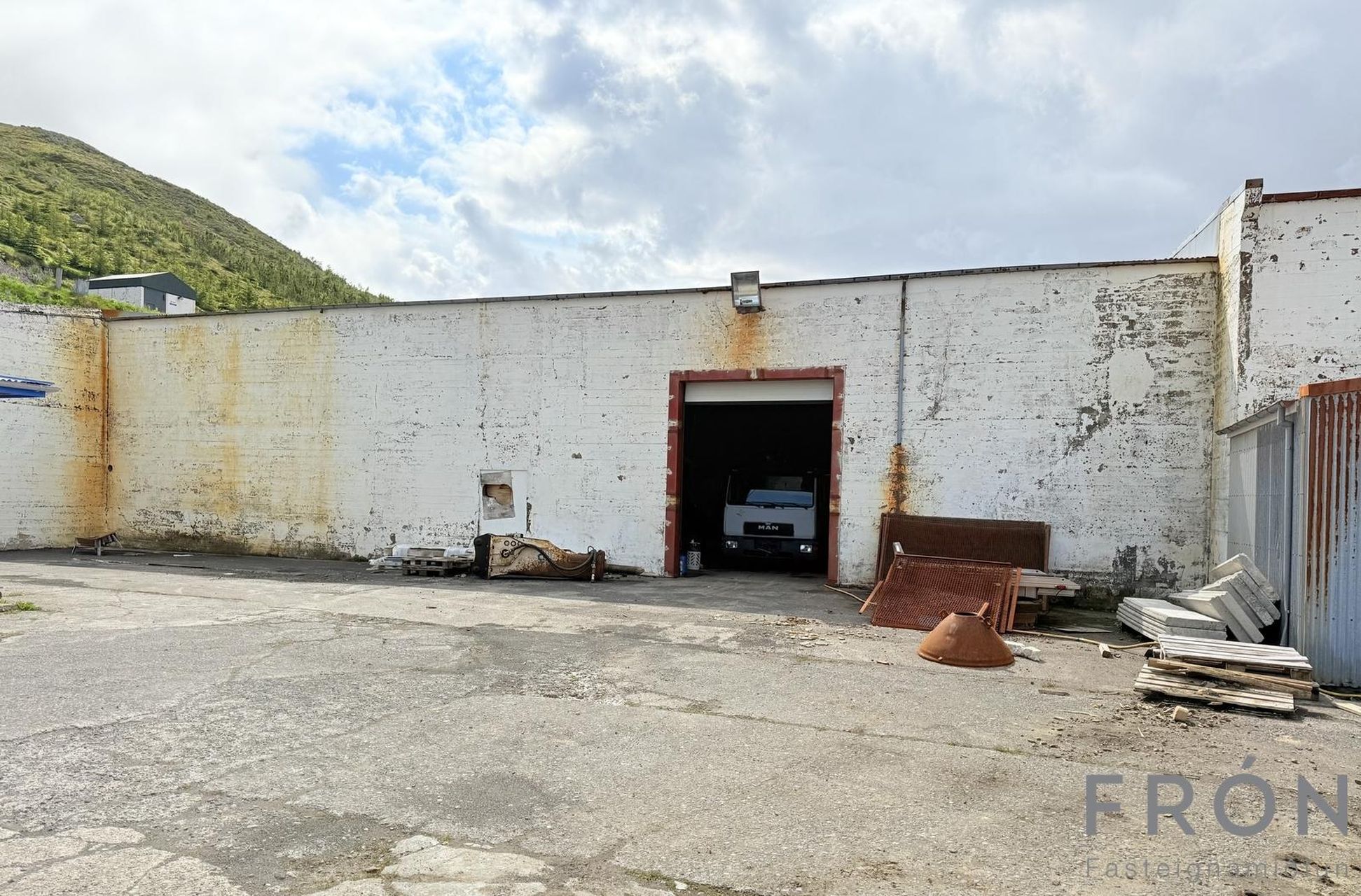 Mikið athafnapláss er á lóðinni, einum innan við húsið. Hægt að aka í gegnum húsið, tvær innkeyrsludyr.