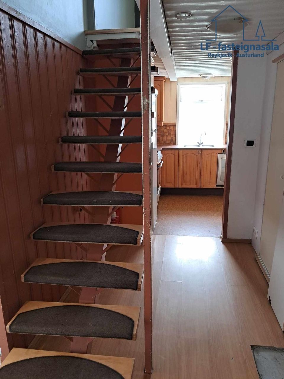 Við enda gangsins er eldhús með borðkrókur. Inn af eldhúsinu er búr/geymsla með dúk á gólfi, þar er hitainntakið fyrir húsið. Stigi á járngrind er á milli hæða.