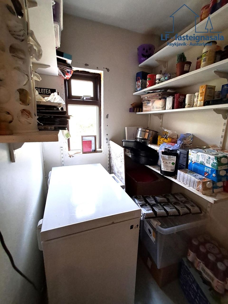 Við eldhúsið sem er frekar rúmgott er rúmgóð geymsla/búr á aðra hönd.