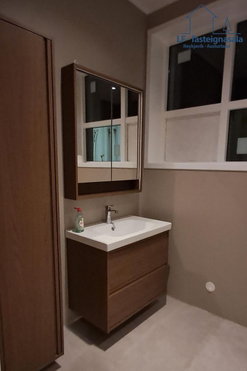 Baðherbergi er að hluta til flísalagt og með sturtu, upphengdu salerni með innbyggðum wc kassa og nýrri baðinnréttingu í dökkum viðarlit. Innfelld dimmanleg lýsing og ljósakappi.