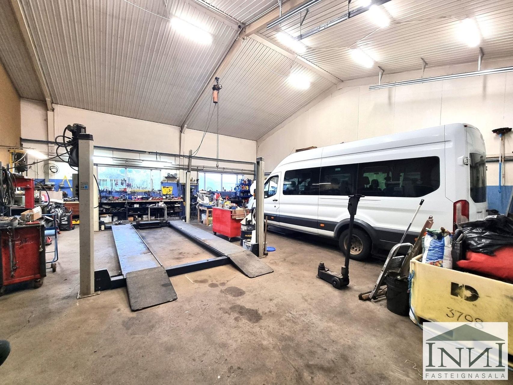 Eignarhluturinn sem um ræðir er einn af þremur eignarhlutum í húsinu og er að mestu salur með góðri lofthæð og tveimur stórum bílhurðum. Einnig er þar kaffistofa, salerni, lagerrými og yfir þessum rýmum er mjög fínt milliloft.