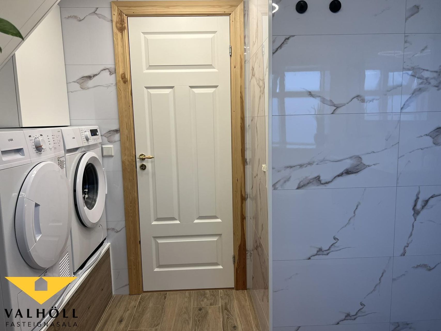 Baðherbergi: flísar á gólfi, hvít hreinlætistæki, sturtuklefi, tengi fyrir þvottavél og þurrkara.