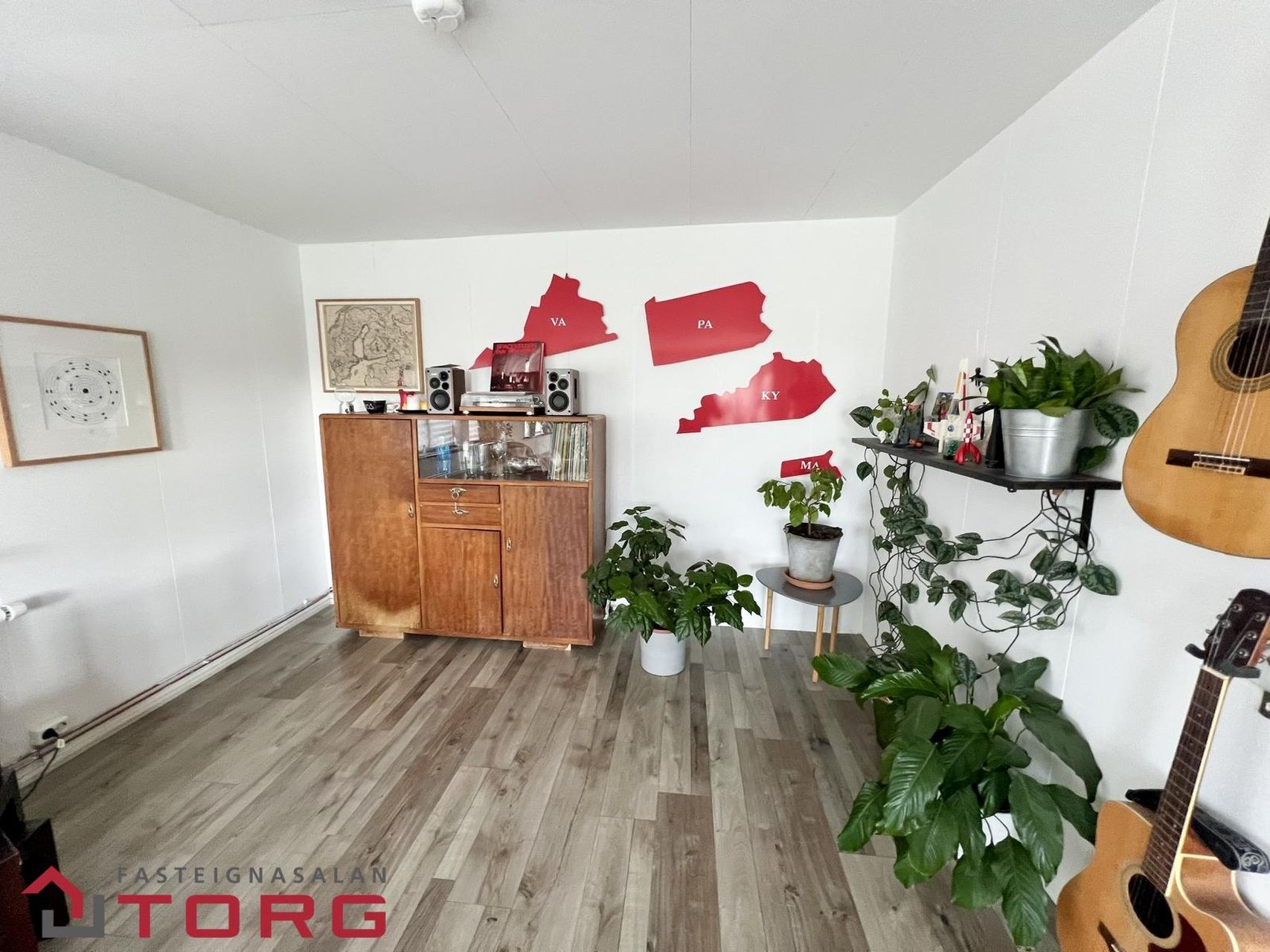 forstofa, eldhús, baðherbergi, stofu/borðstofu, þvottahús og herbergi yfir þvottahúsinu. Innréttingar í eldhúsi og á baði eru gamlar og þarfnast endurnýjunar. Timburstigi upp í risið. Tvö svefnherbergi og lítill gangur.