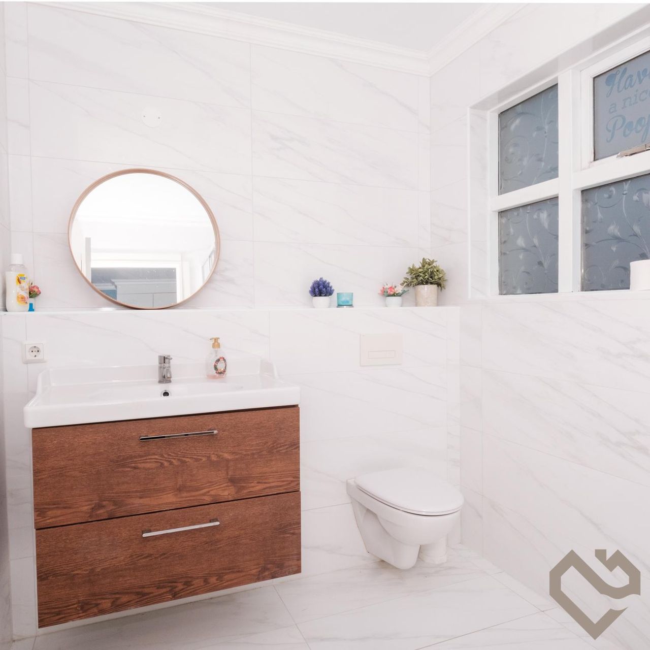 Baðherbergi 1: Flísar í hólf og gólf, upphengt wc, innrétting, opnanlegur gluggi, allt nýuppgert.