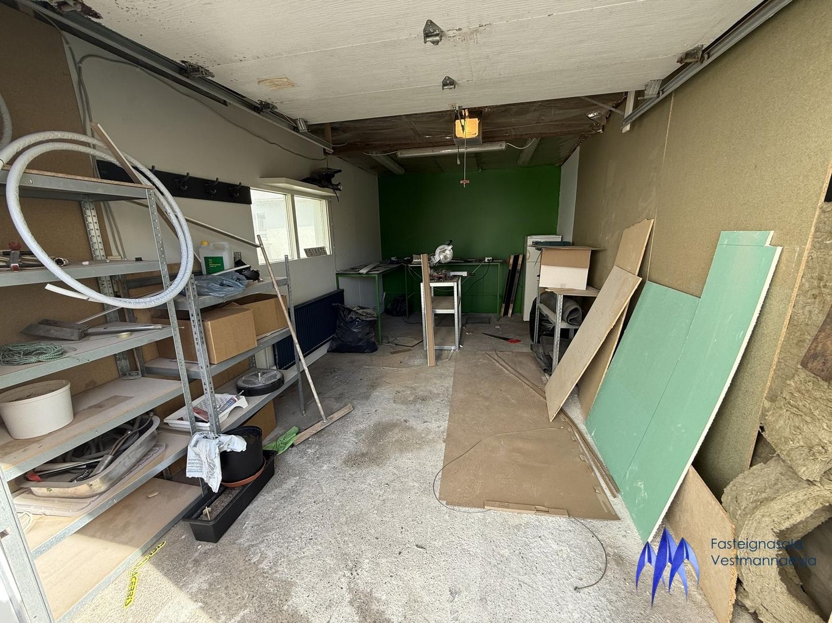 Bílskúr er skráður 19,8 fm en tveir bílskúrar tilheyra húsinu (norðurskúrinn tilheyrir þessari íbúð). Rafmagn er í bílskúr og búið setja einn ofn sem tengdur er hitaveitu og leggja rör fyrir heitt og kalt vatn (á eftir að tengja).