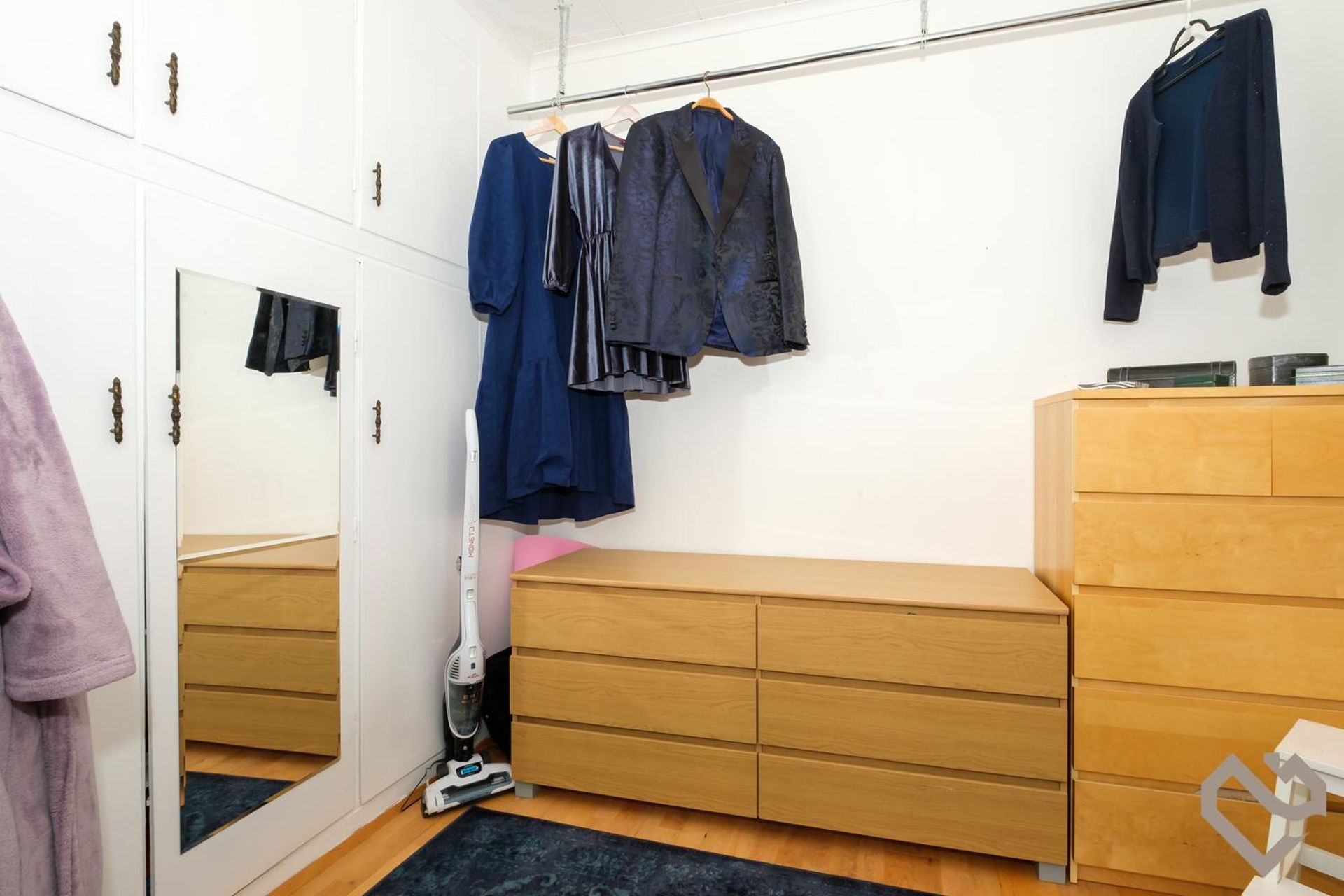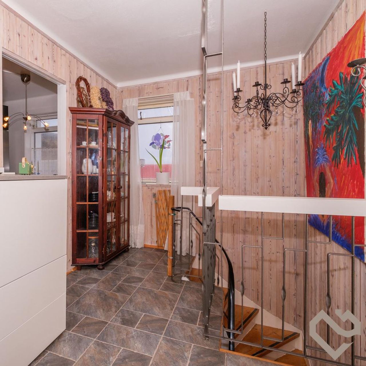 Forstofa: Kork flísar á gólfi, skóskápur undir stiga, fatahengi