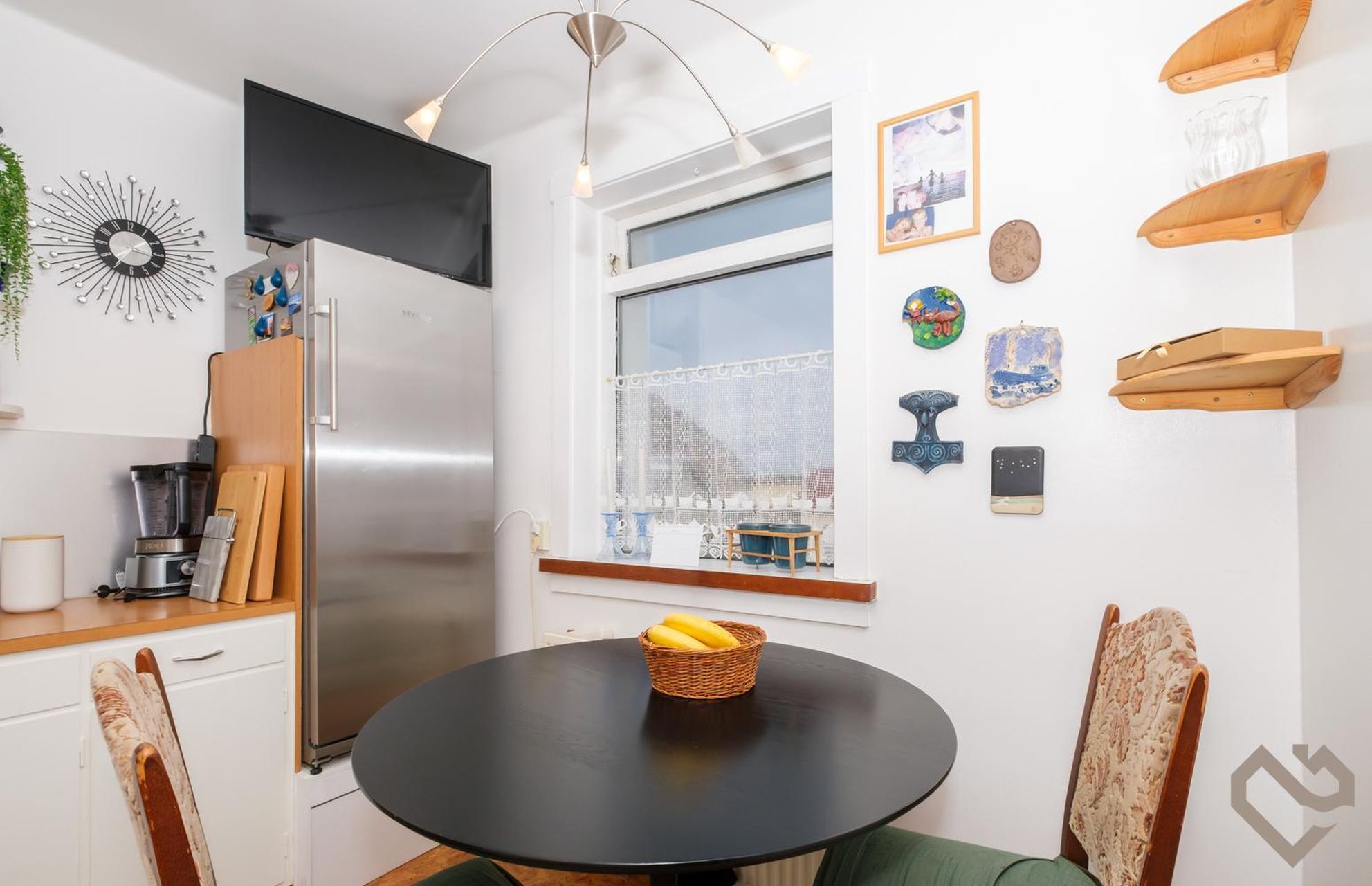 Eldhús: Dúkur á gólfi, snyrtileg eldri innrétting