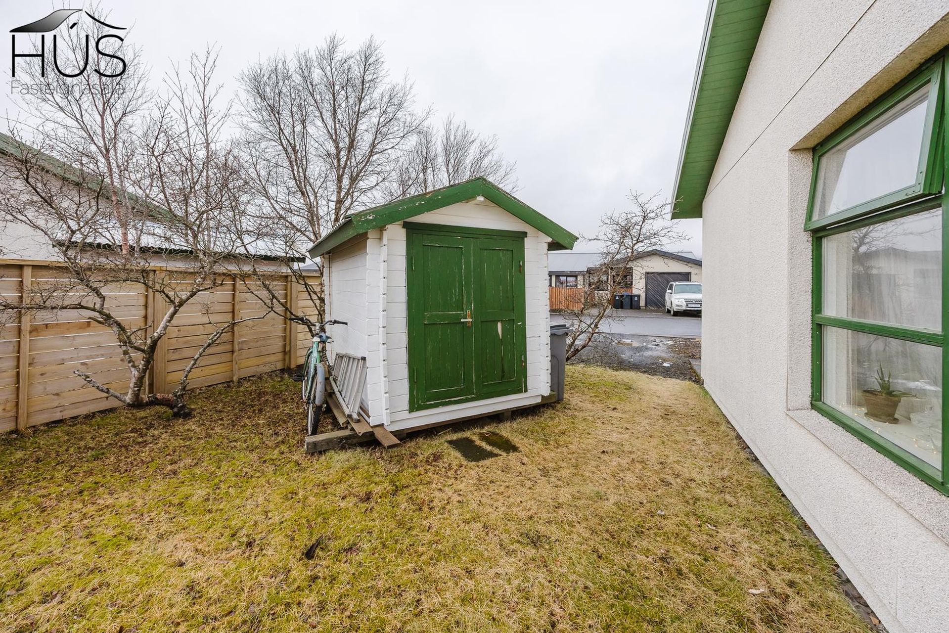 Hellulögð verönd, gróinn suðurgarður. Lítið garðhús/geymsla og möl í innkeyrslu.