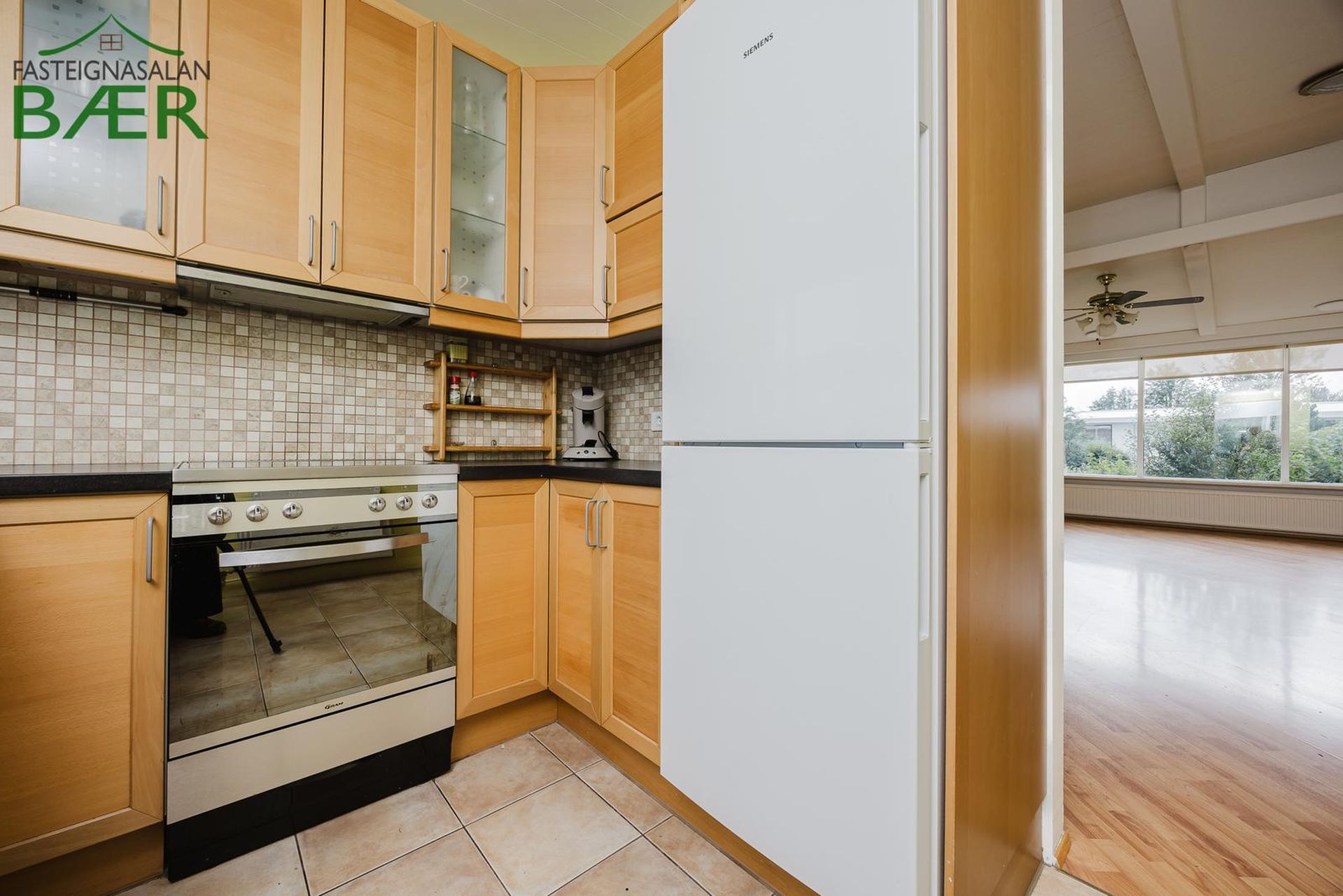 Eldhús er með snyrtilegri viðarinnréttingu. Rúmgóð stofa/borðstofa með útgengi út á timbur verönd. Tvö rúmgóð svefnherbergi með skápum. Lítil geymsla sem nýtt getur verið sem svefnherbergi. Baðherbergi flísalagt í hólf og gólf, baðkar með sturtu, tengt fyrir þvottavél. Rúmgóður 26 fm innbyggður bílskúr. Gróinn suðurgarður. Um er að ræða áhugaverða eign sem þarfnast umönnunar og smá viðhalds.