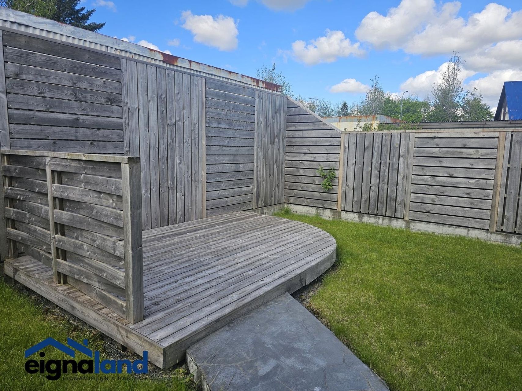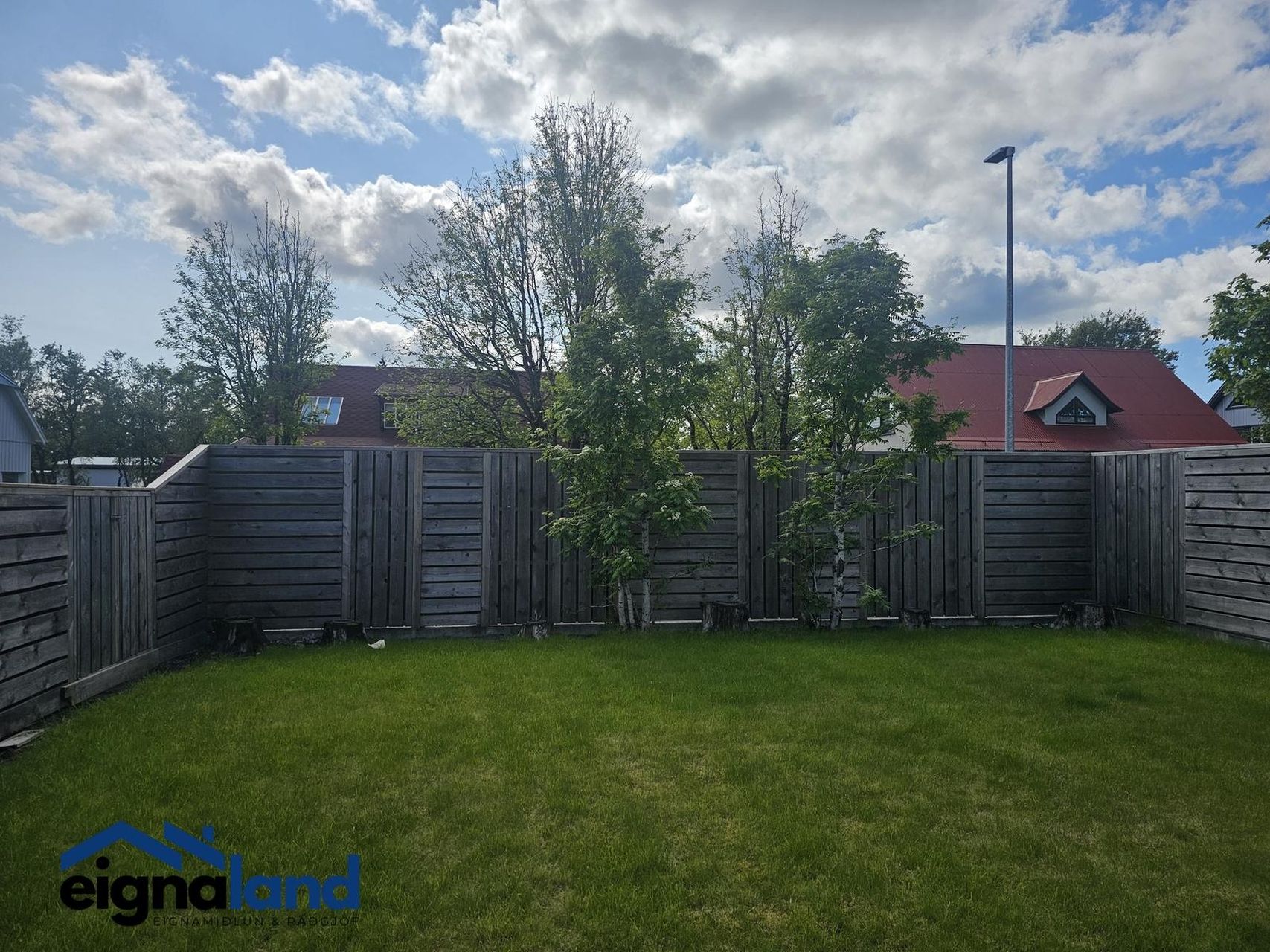 Garðurinn er virkilega fallegur með girðingu allan hringinn og góðum pöllum.
