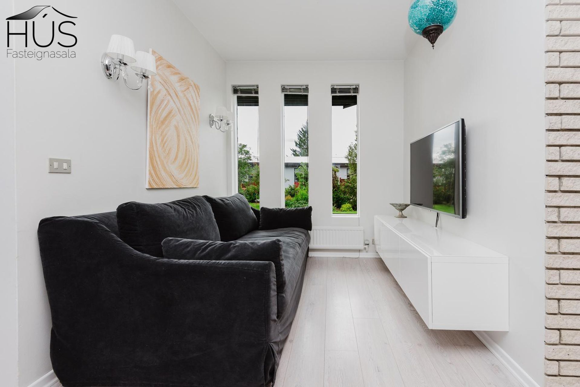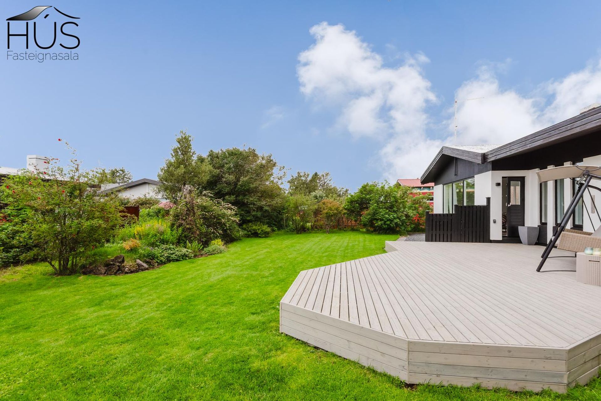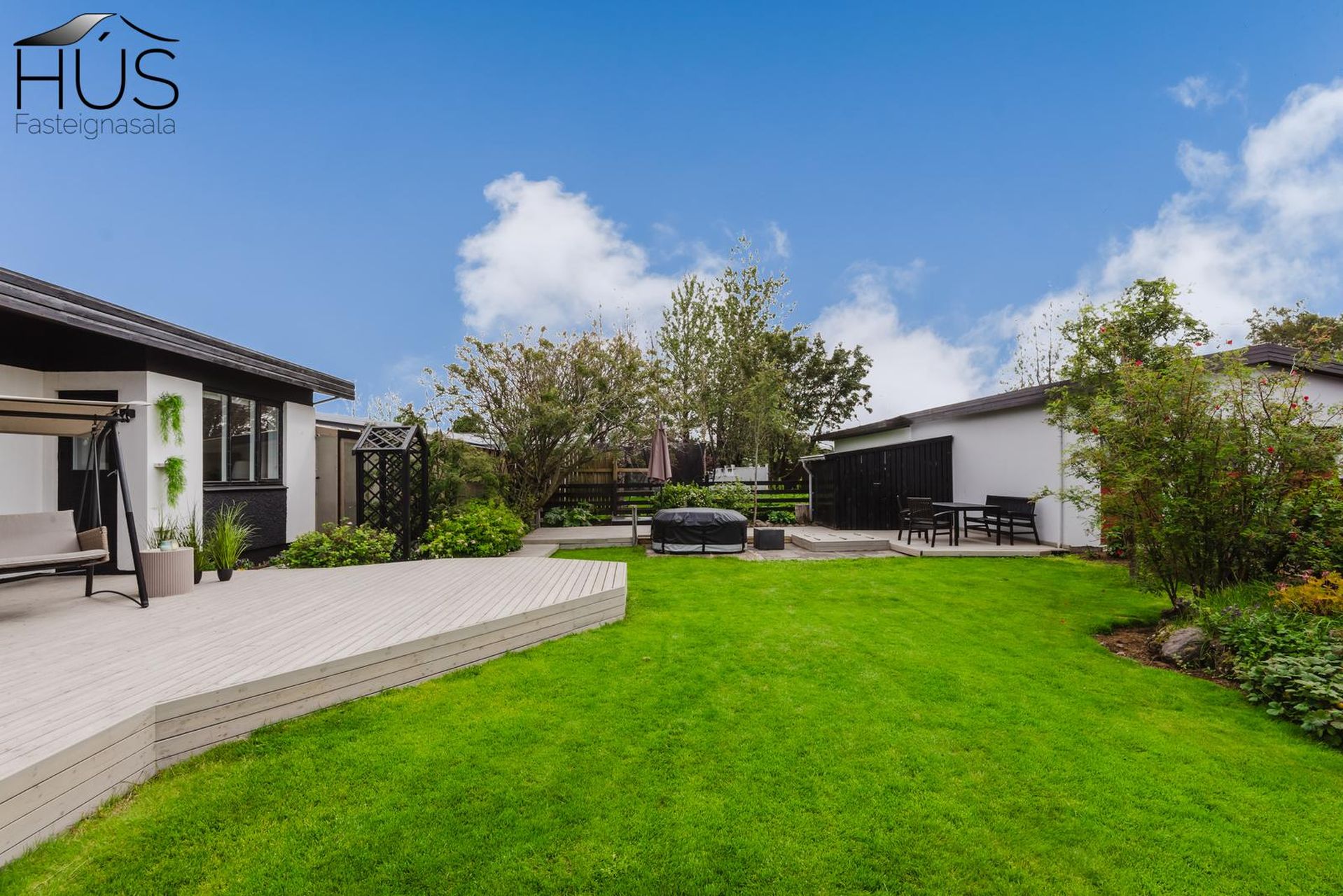 Lýsing eignar: Flísalögð forstofa með góðum fataskáp og fatahengi, parketlagt forstofuherbergi, borðstofa og björt stofa með hlöðnum arni, upptekið loft í stofu og úr henni eru dyr út á sólpall þar sem er gríðarleg veðursæld og skjól. Gangur og tvö herbergi parketlögð, þ.a. hjónaherbergi með fataherbergi og fataskáp. Sjónvarpshol. Eldhús er flísalagt og rúmgott með upprunalegri málaðri innréttingu. Inn af eldhúsi er parketlagt svefnherbergi. Baðherbergið er stórt, flísalagt með hita í gólfi, baðkari og sturtu. Á baðherbergi er einnig gert ráð fyrir þvottavél og þurrkara og þar er einnig stór fataskápur. Rúmgóður bílskúr með miklu skápaplássi og í framhaldi af bílskúr er garðskáli með vínvið og úr honum er útgengt á sólpallinn. Hús í góðu standi og allt viðhald gott í gegnum tíðina. Fjögur svefnherbergi og möguleiki á að bæta því fimmta við.
