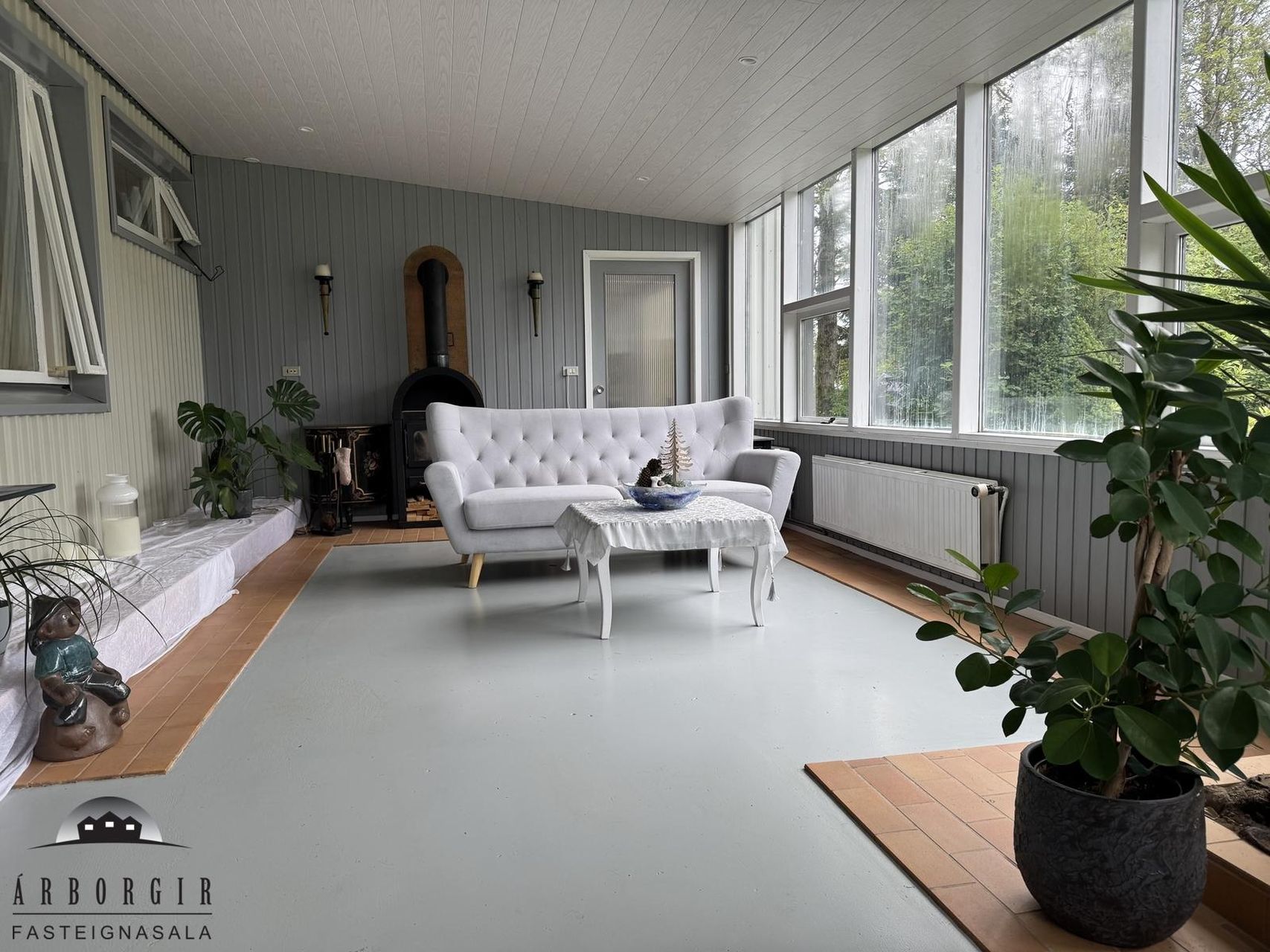 Sólskálinn er flísalagður að hluta, í enda hans er falleg kamína. Nýlegt járn er á þaki á sólskálanum.
