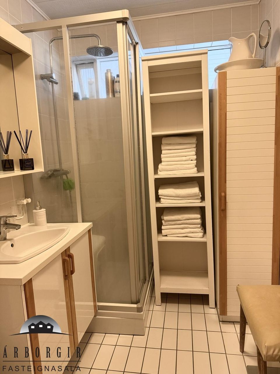 Baðherbergi er flísalagt bæði gólf og veggir en þar er fín innrétting og sturta.