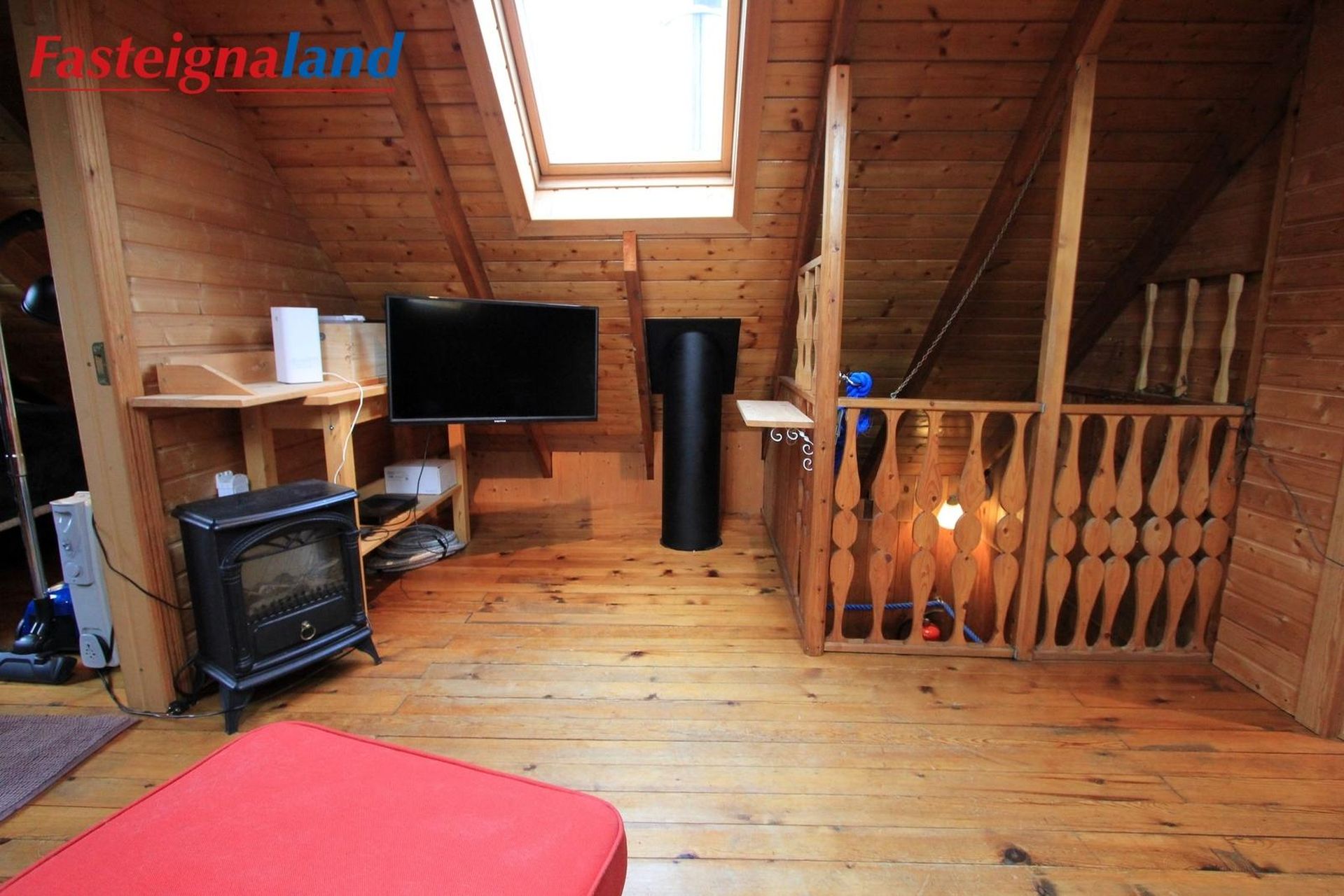 Efri hæð: Þar eru tvö herbergi í sitthvorum enda hússins en miðjan er nýtt sem sjónvarpsrými.