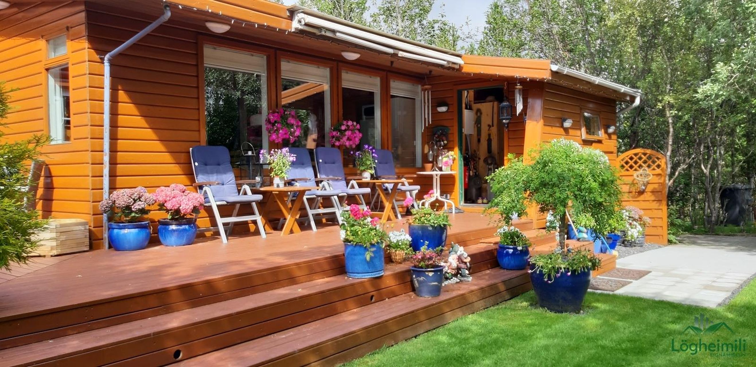 Lóð: Tyrft lóð með miklum gróðri og háum trjágróðri. Heitur pottur er á sólpalli sem liggur í vestur- og suður átt.