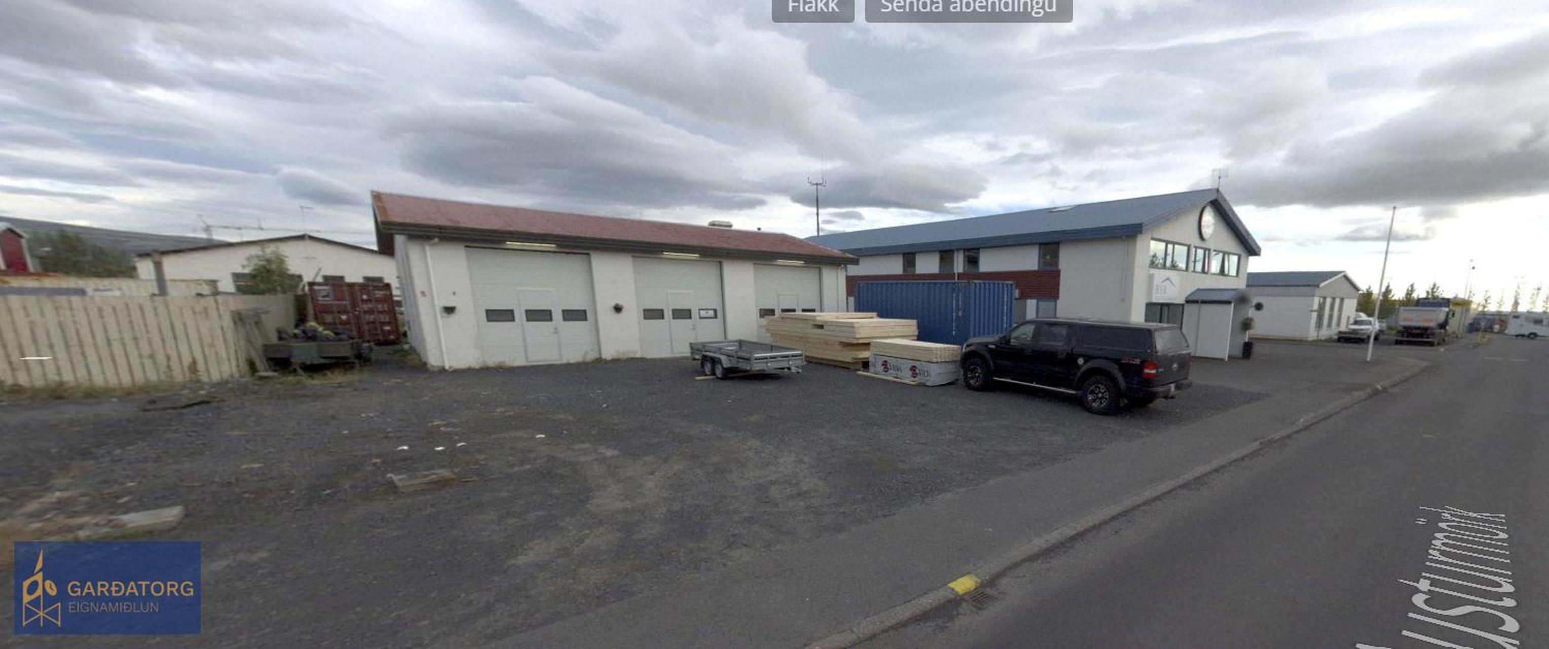 Vel skipulagt 191,3m2 atvinnuhúsnæði með þremur stórum innkeyrsluhurðum. Búið er að skipta eigninni niður í þrjú bil og á hverju bili eru stórar innskeyrsluhurðar. Búið er að gera tveggja herbergja íbúð í einu bili hússins með sérinngangi á hlið hússins. Endabilið er með millilofti yfir helming rýmisins. Að sögn seljenda er möguleiki á stækkun þar sem byggingaréttur er á lóðinni. Lóðin er 903.7m2 og er því gott útisvæði sem fylgir húsinu.