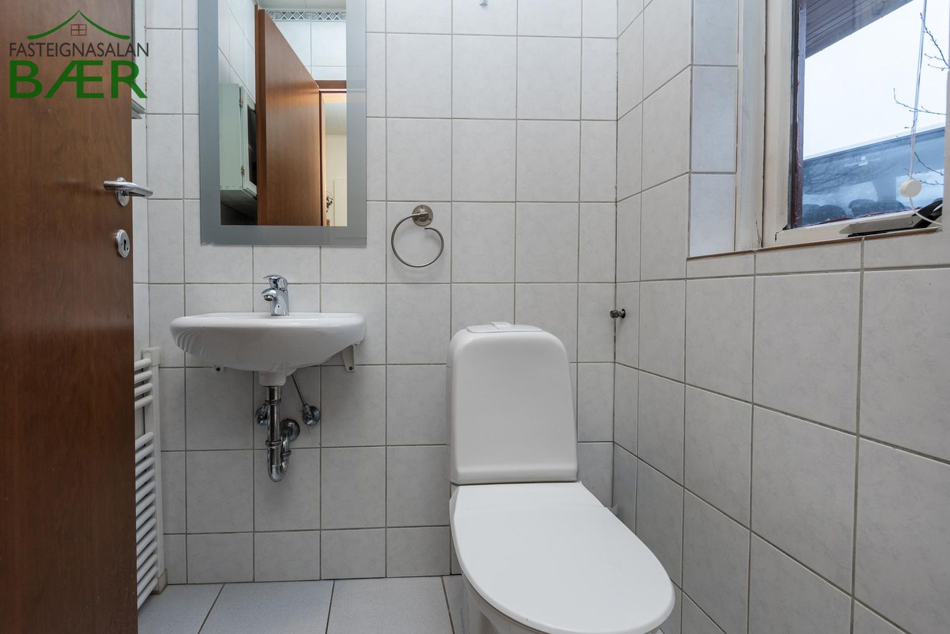 Forstofa með flísum á gólfi og fataskáp. Gestasnyrting er inn af forstofu flísalögð í hólf og gólf og með glugga. Eldhús með flísum á gólfi, eldri innrétting og borðkrókur.