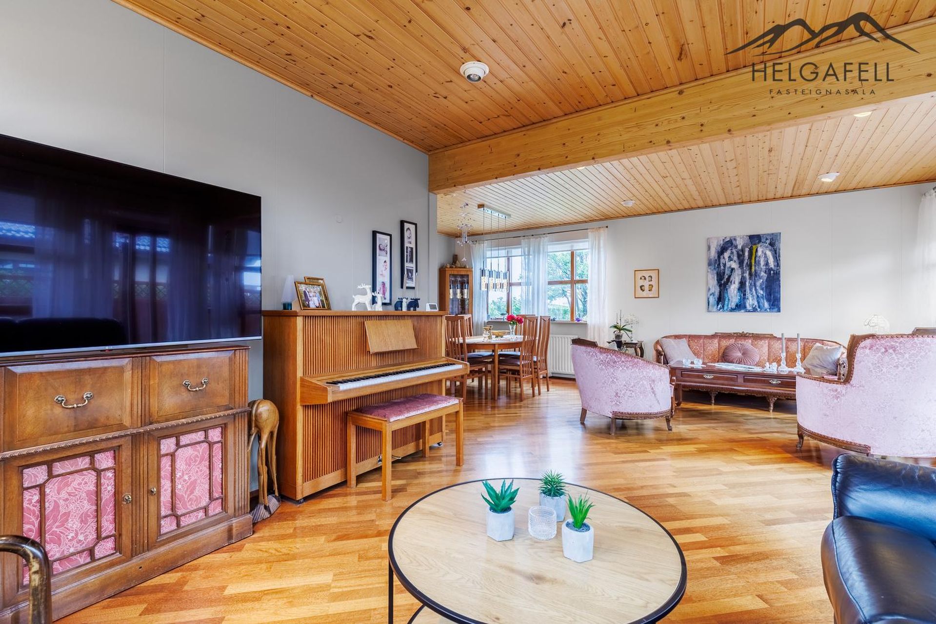 Stofa / borðstofa: Stór og björt, útgengi út á suðvestur sólpall, parket á gólfi.