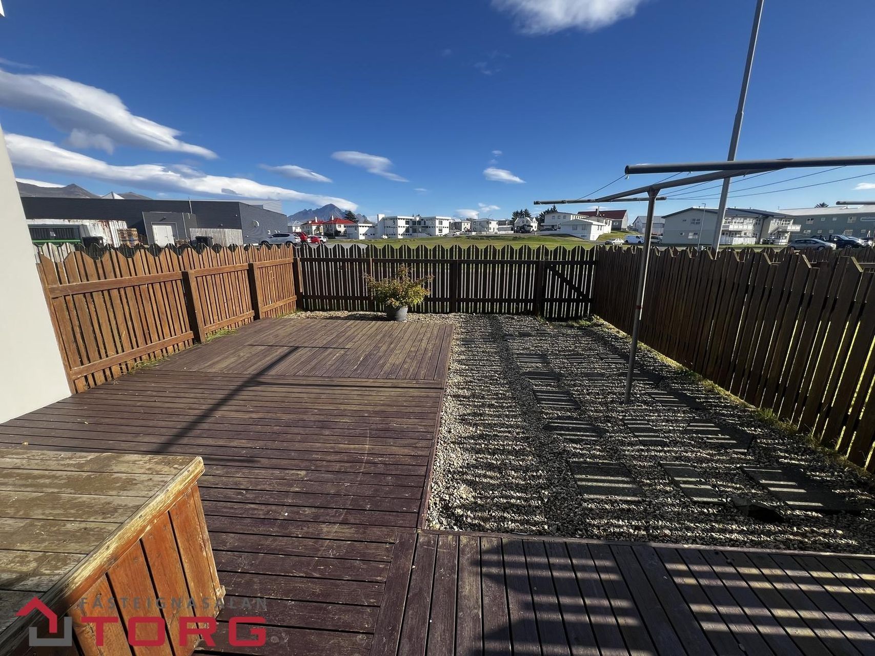 Lóðin er með skjólveggjum og pöllum bæði við báða innganga. Bifreiðastæðið er malbikað og bílskúrsréttur fylgir þessari íbúð.