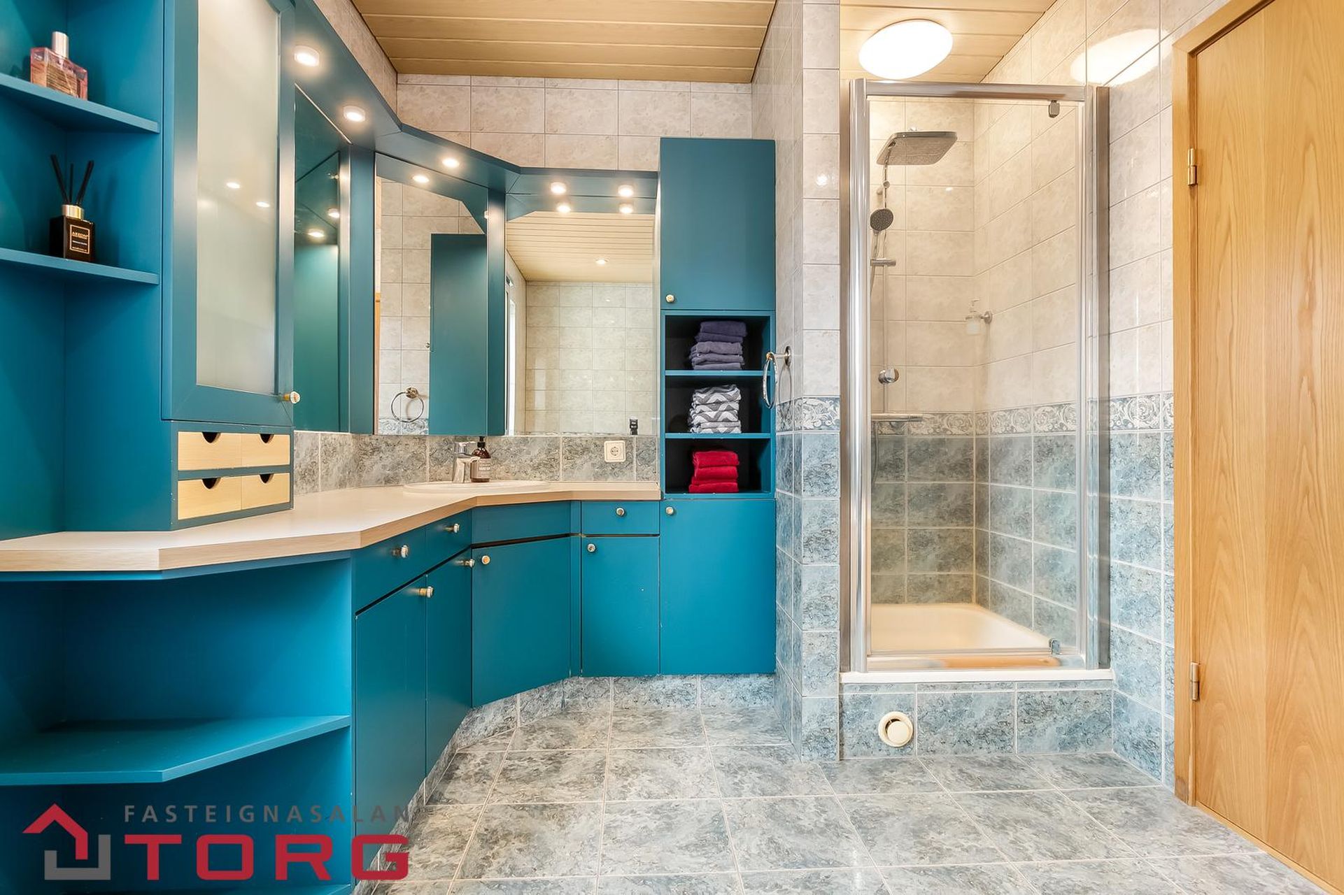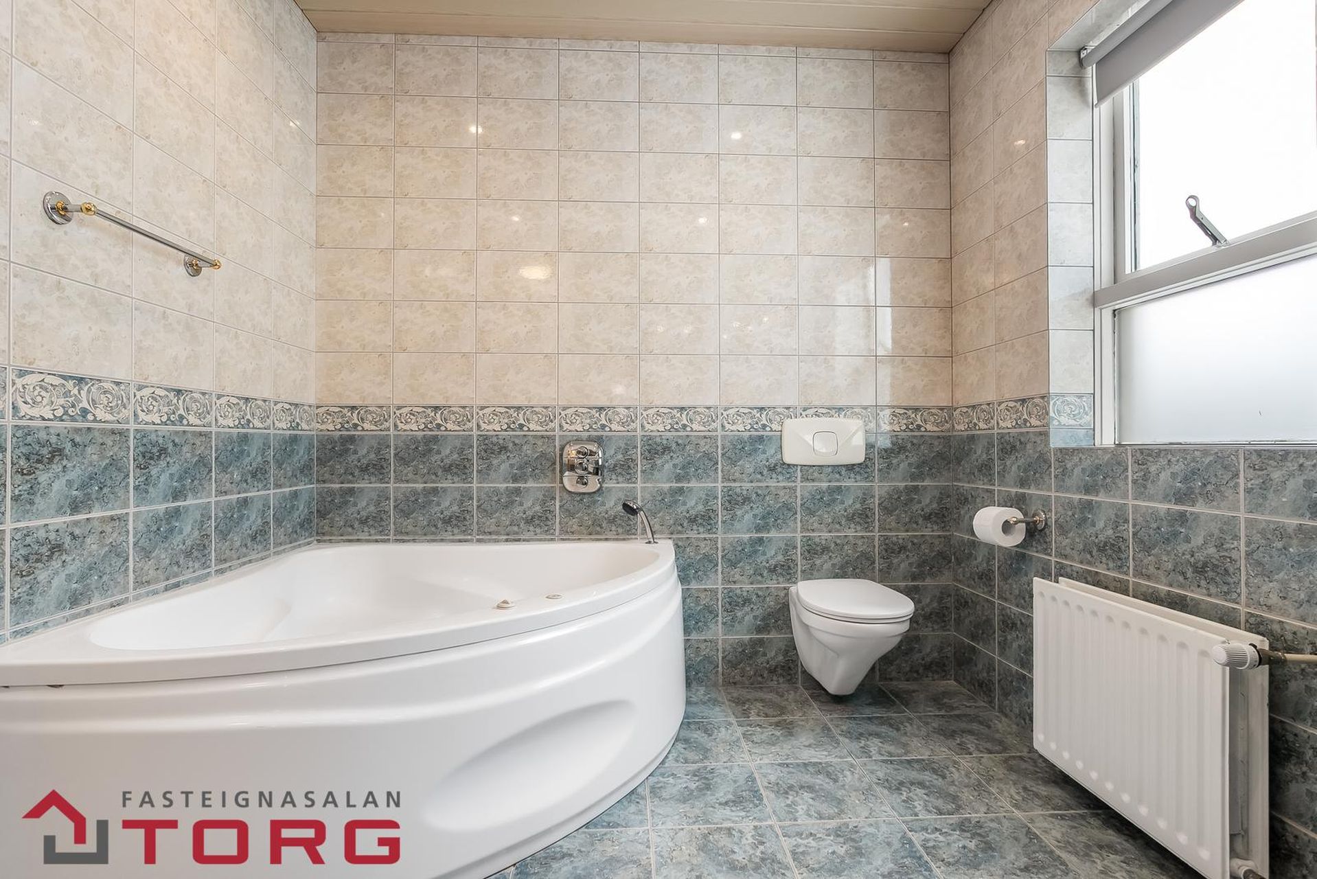 Baðherbergi: Afar rúmgott, hornbaðkar, sturtuklefi, góð innrétting með miklu skúffu og skápaplássi. Flísalagt gólf og veggir Opnanlegur gluggi.