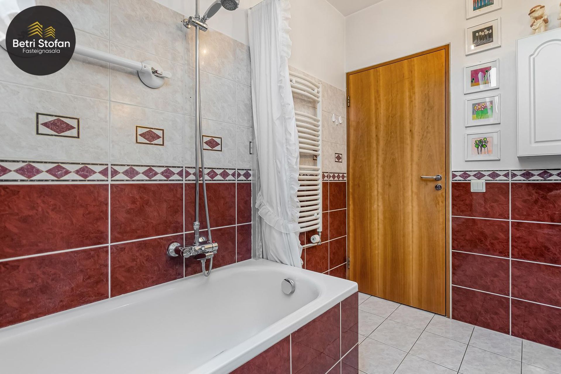 Baðherbergi flísalagt í hólf og gólf, innrétting þar, handklæðaofn, tengi fyrir þvottavél.