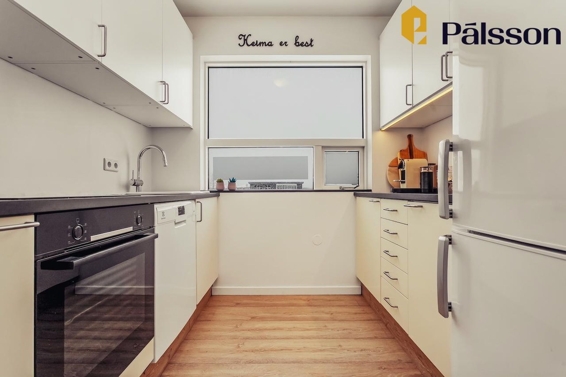 Eldhús er með hvítri innréttingu og dökkri borðplötu, bakaraofni, helluborði og stæði fyrir uppþvottavél. Parket á gólfi.