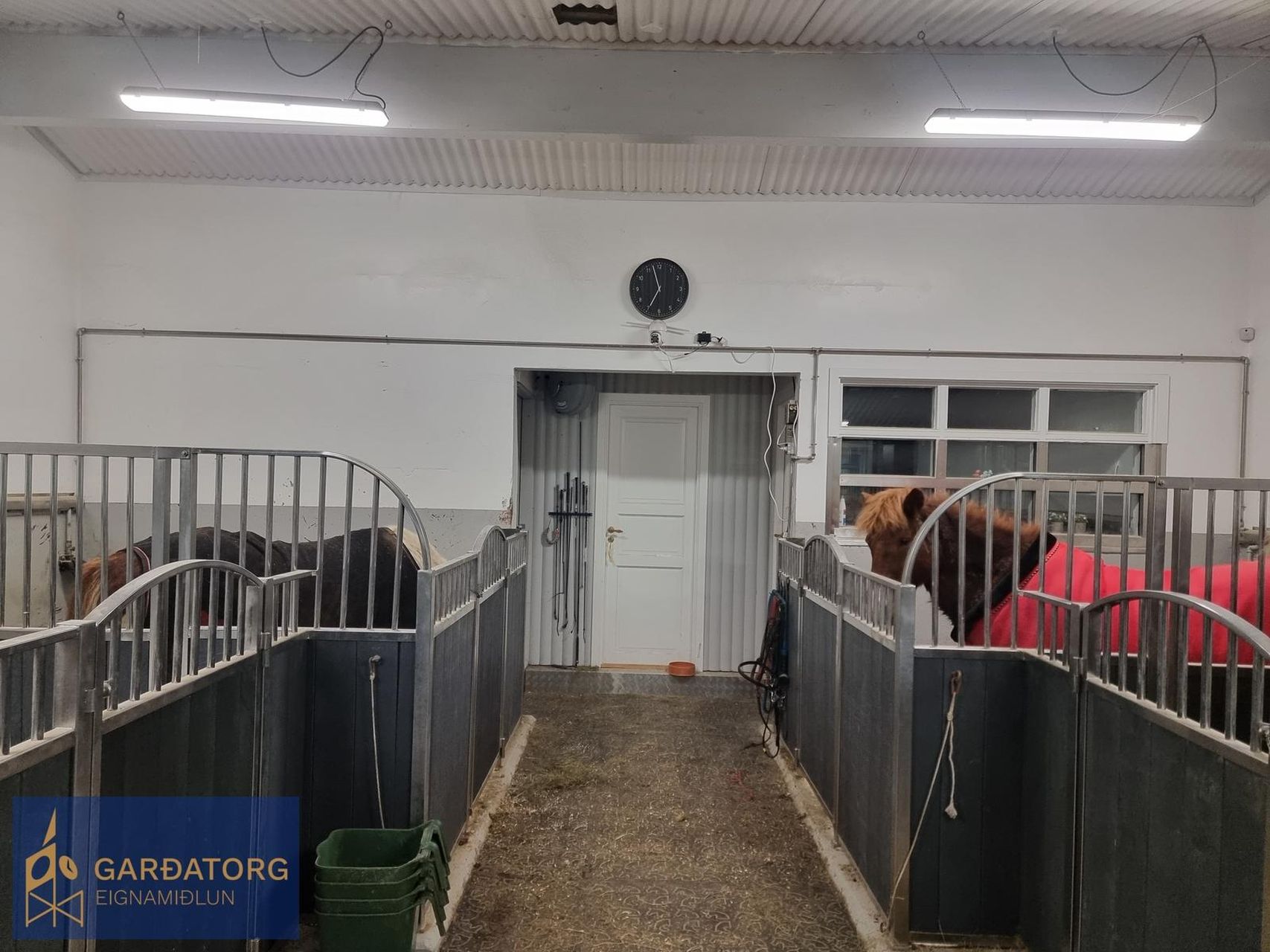 Breiður hesthúsa gangur eftir miðju húsi með þykkum læstum gúmmímottum
