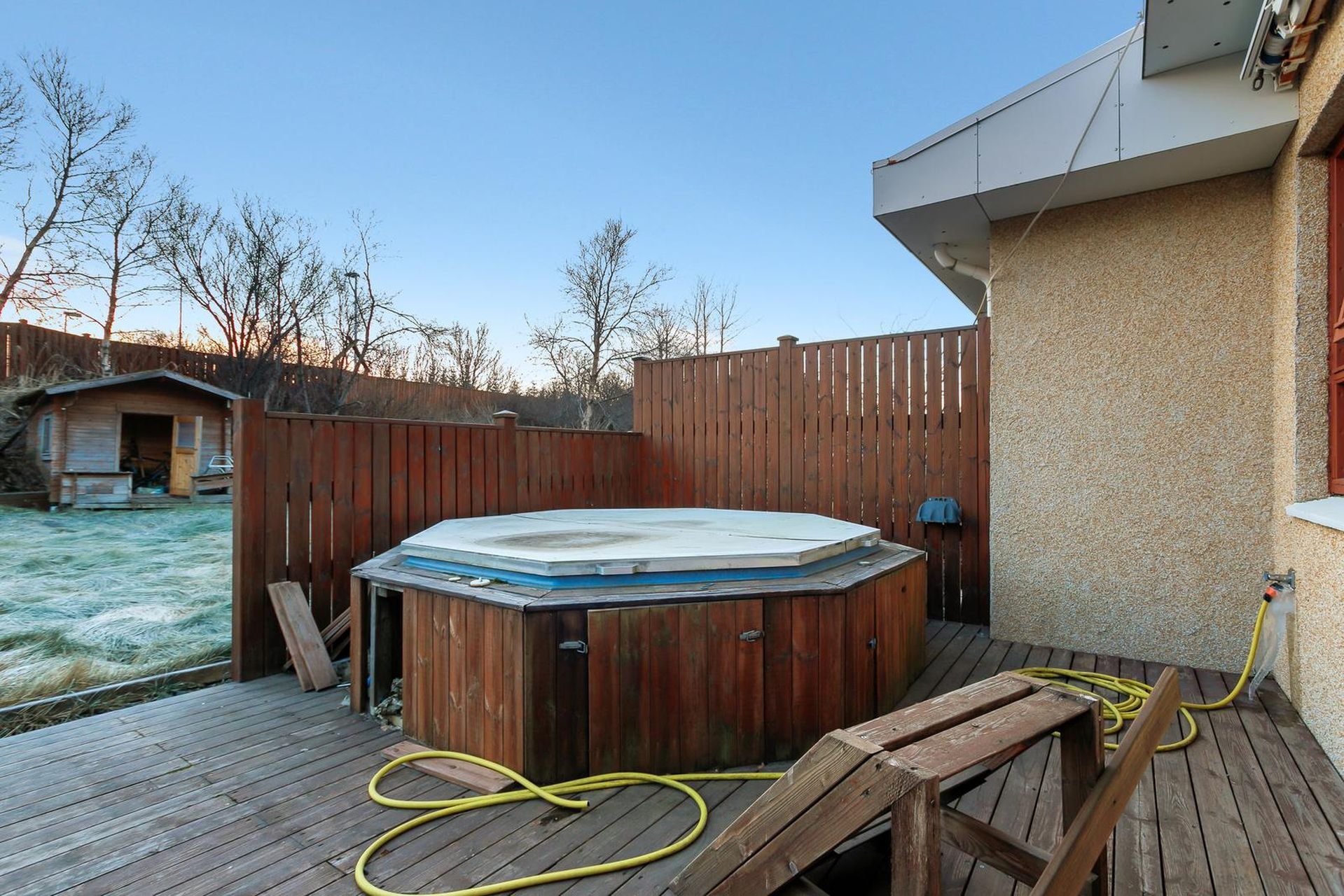 Stofa og borðstofa eru bjartar og rúmgóðar, parket á gólfi, gengt er úr stofu út á suður sólpall þar sem er heitur pottur.