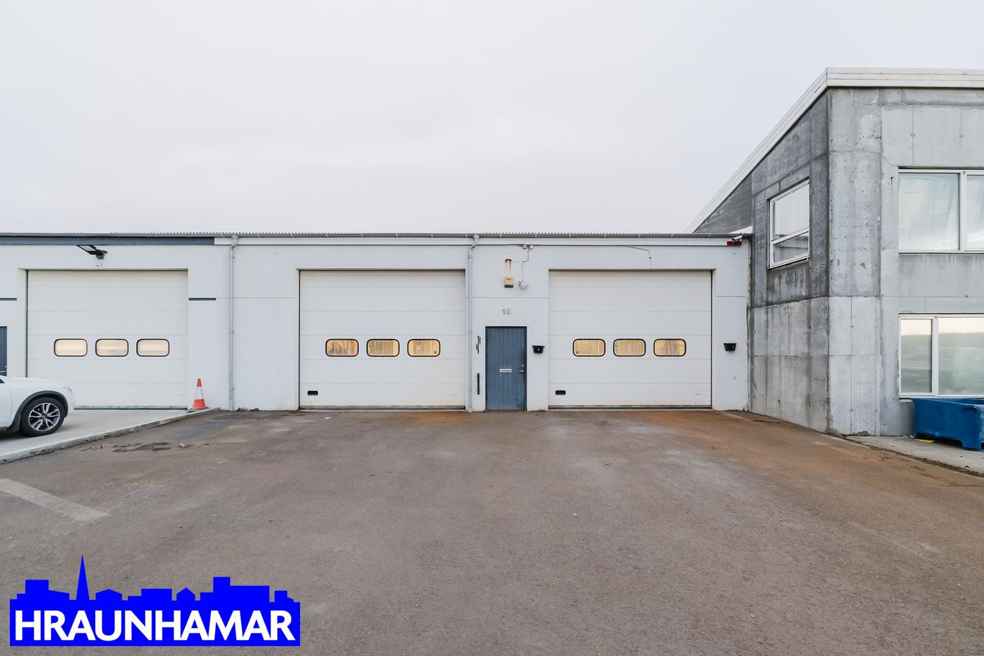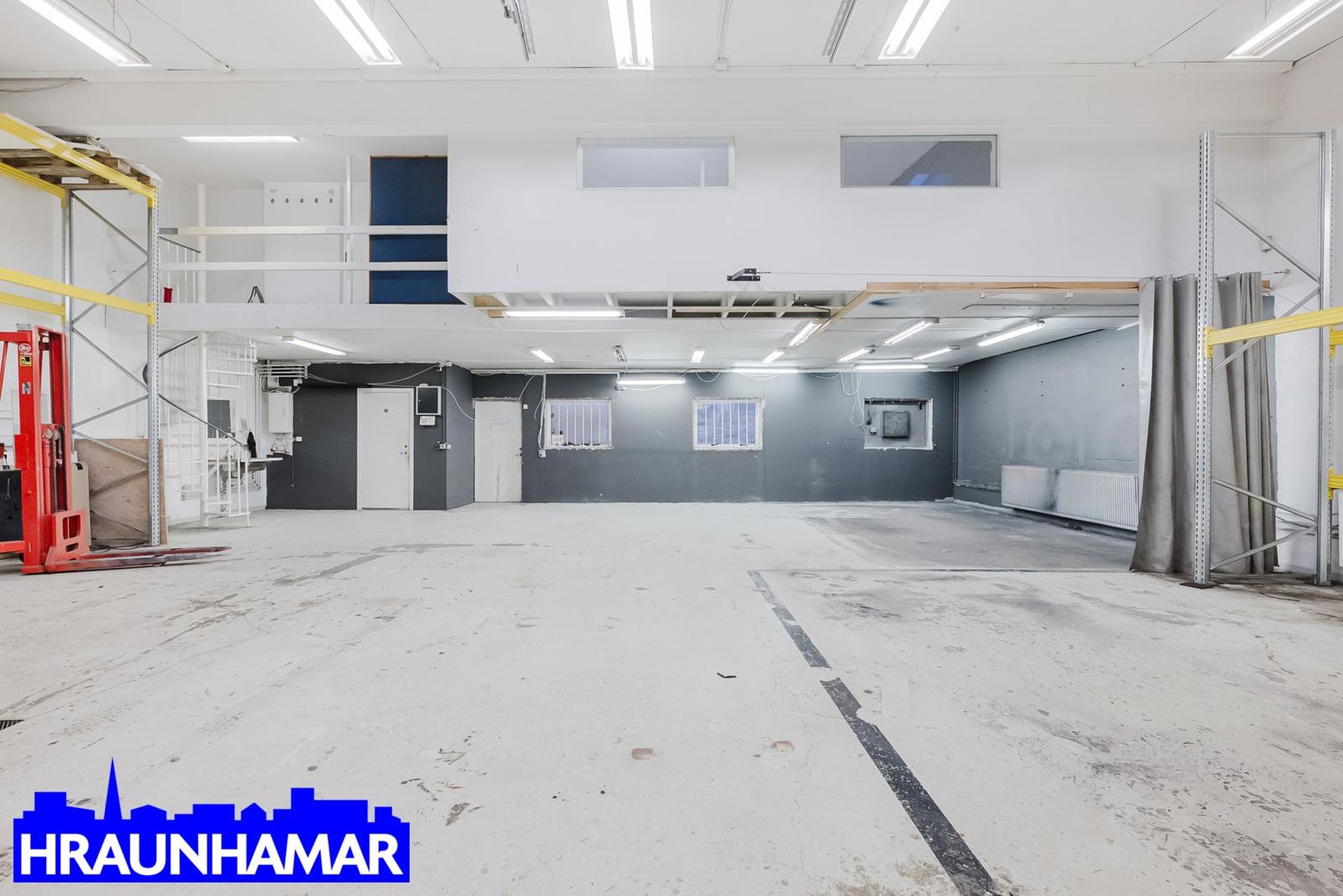 Nánari lýsing: Rúmgott vinnurými, tvær innkeyrsluhurðir og útidyrahurð, Lofthæðin er cirka frá 4,3 metrar upp í 5,5 metrar þar sem hún er mest. Á efri hæðinni er eldhús og geymslurými. Salerni á neðri hæðinni.