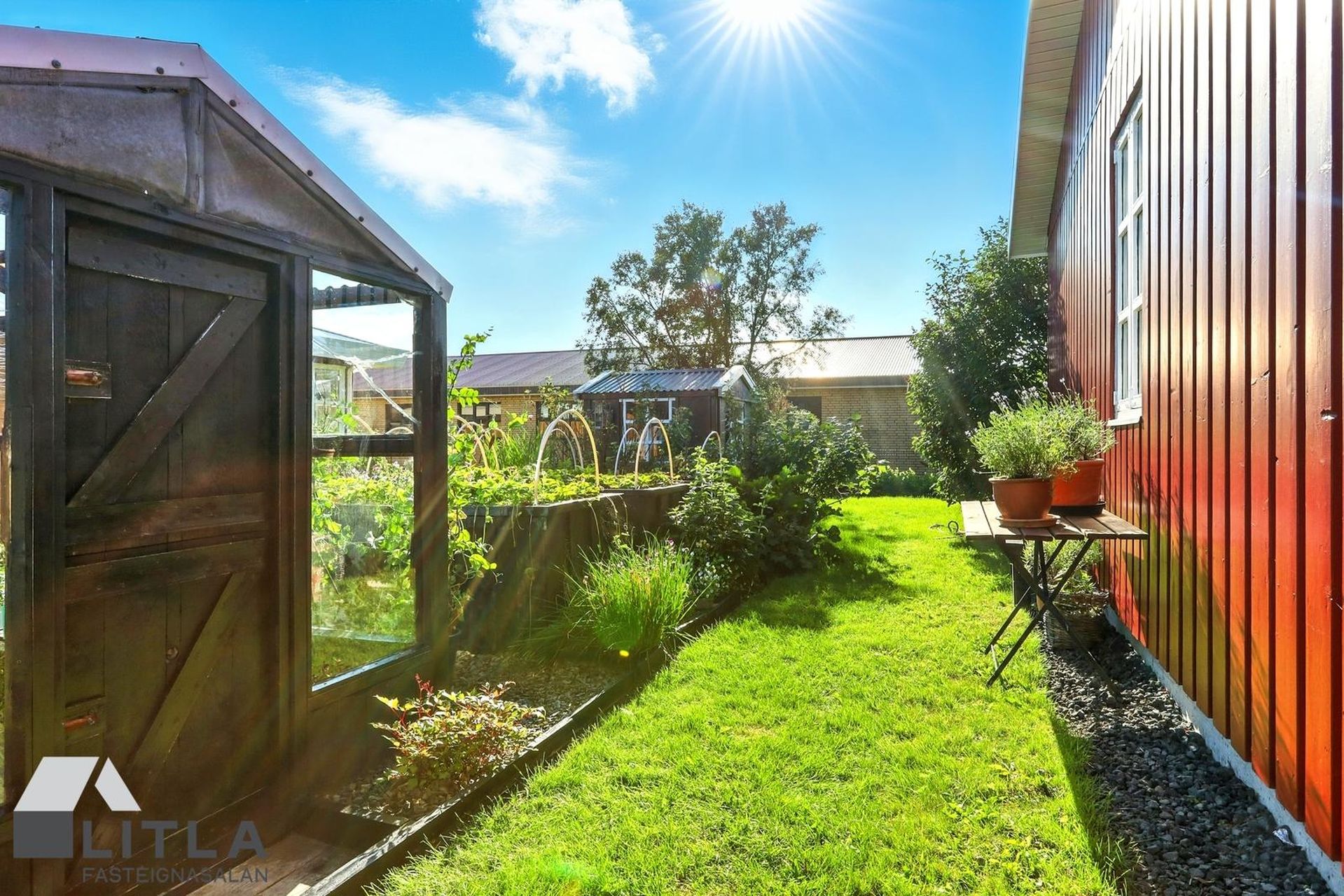 Garðurinn er gróinn sælureitur með lítilli tjörn, upphækkuðum ræktunarkössum, litlu gróðurhúsi