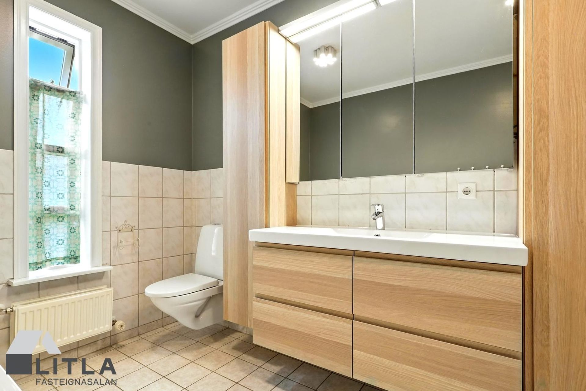 Þvottahús með nýrri innréttingu og vinnuborði, gott skápapláss, flísar á gólfi og opnanlegum glugga,