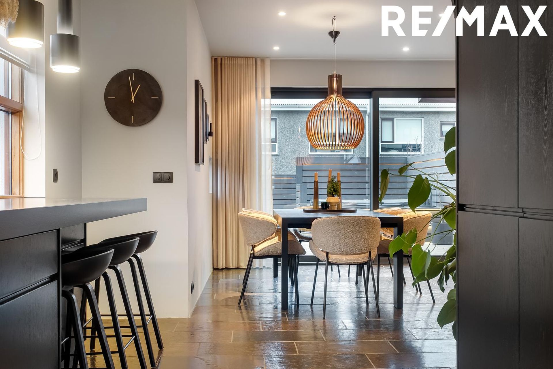 2022 Rennihurð sett úr borðstofu þar sem gegnið er út í garð.