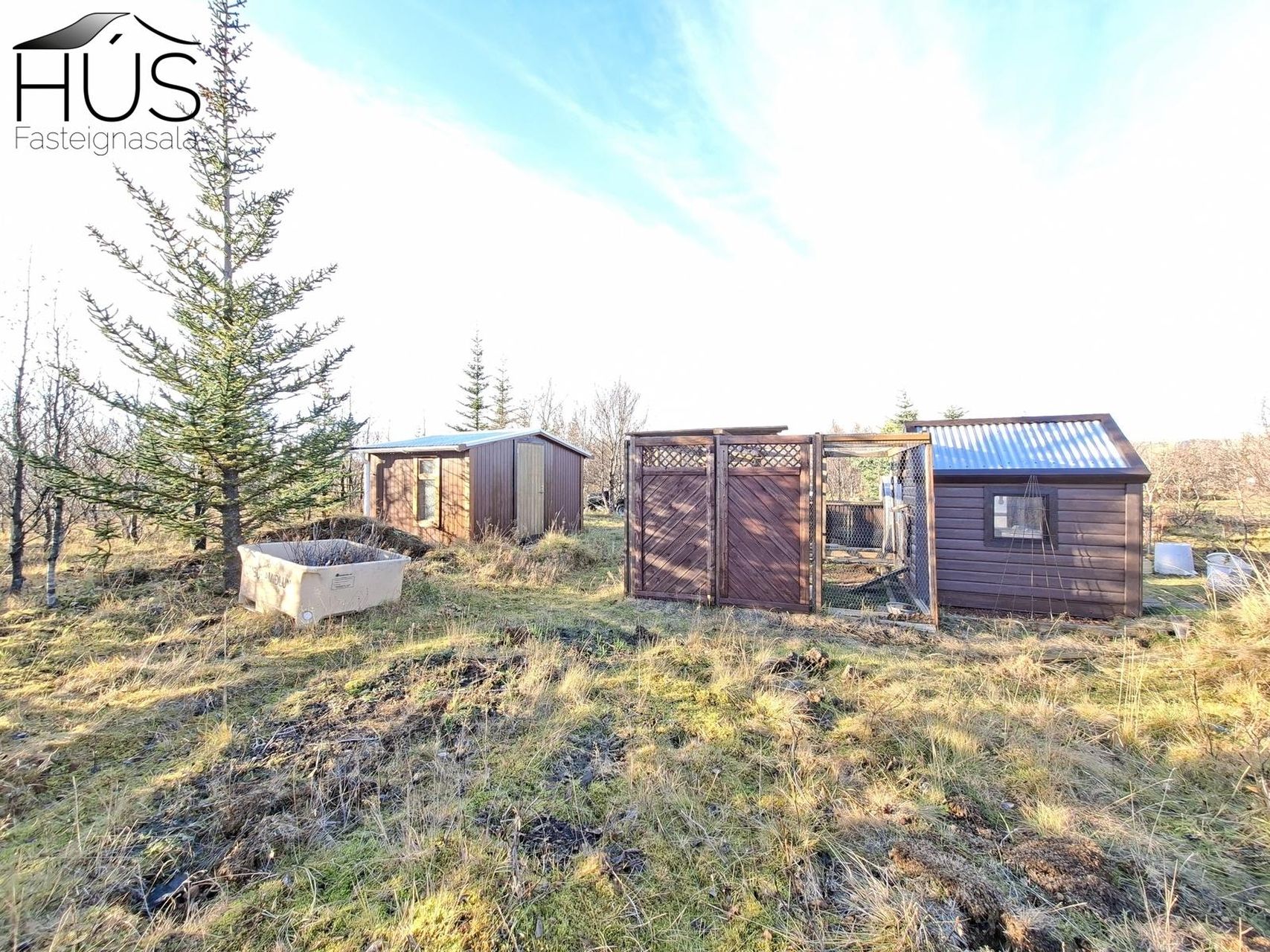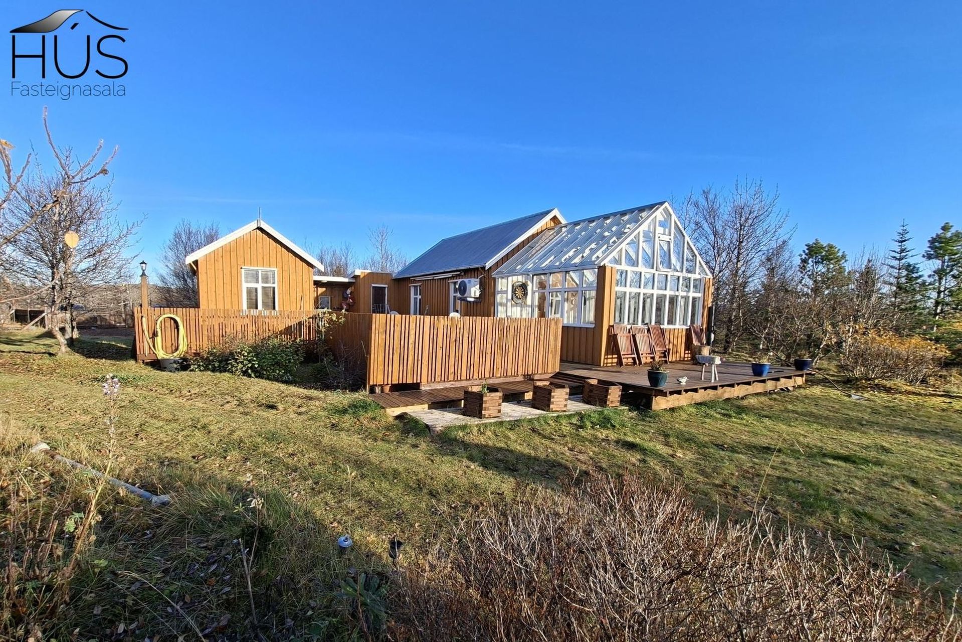 Sólstofa og góður pallur með heitum potti, tvö gestahús, hænsnakofi og niðurgrafið gróðurhús.