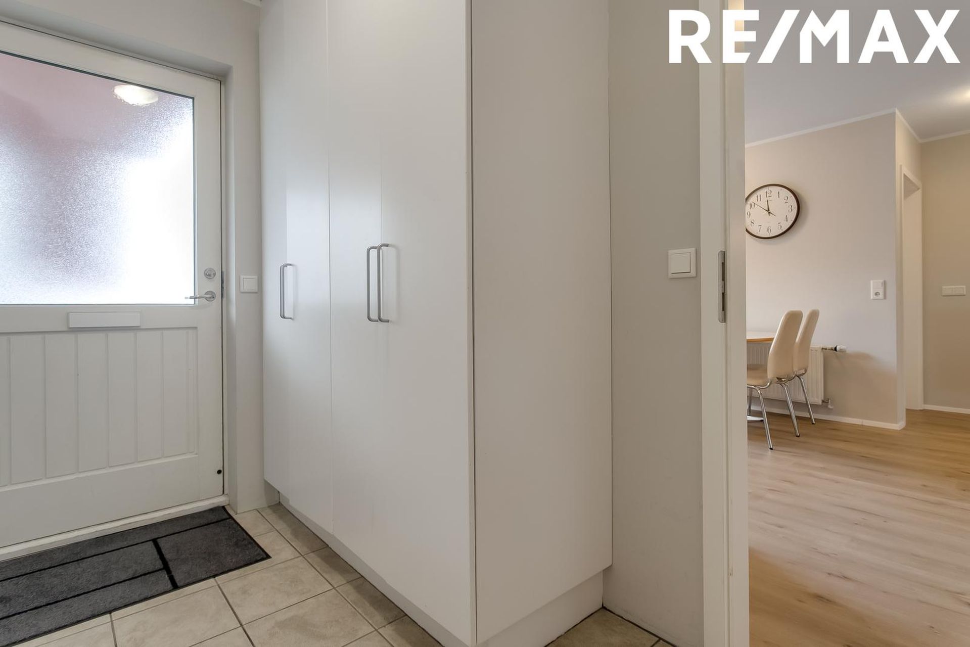 Forstofa er flísalögð með hvítum fataskáp.