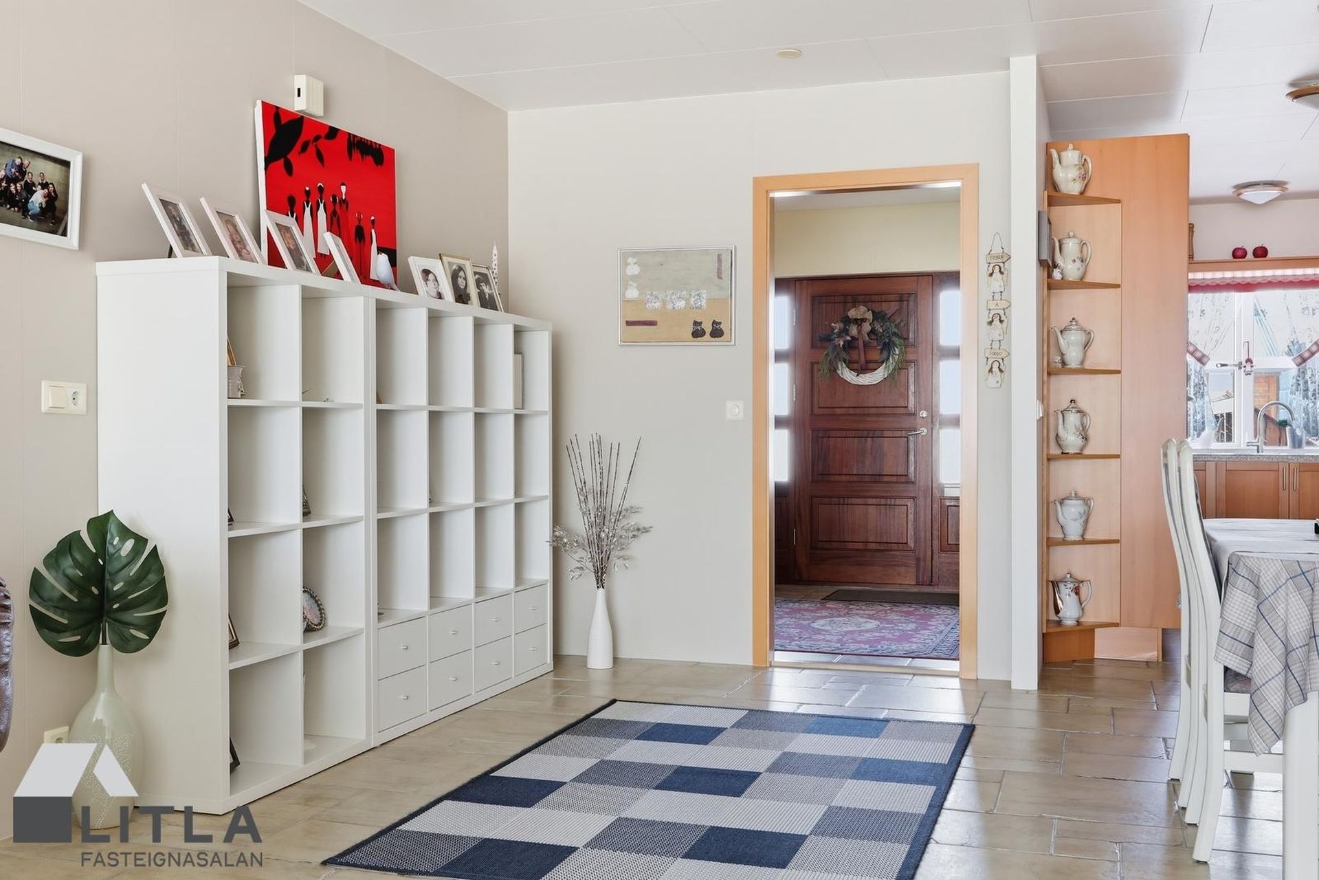 Forstofa er rúmgóð með fataskáp og flísum á gólfi.