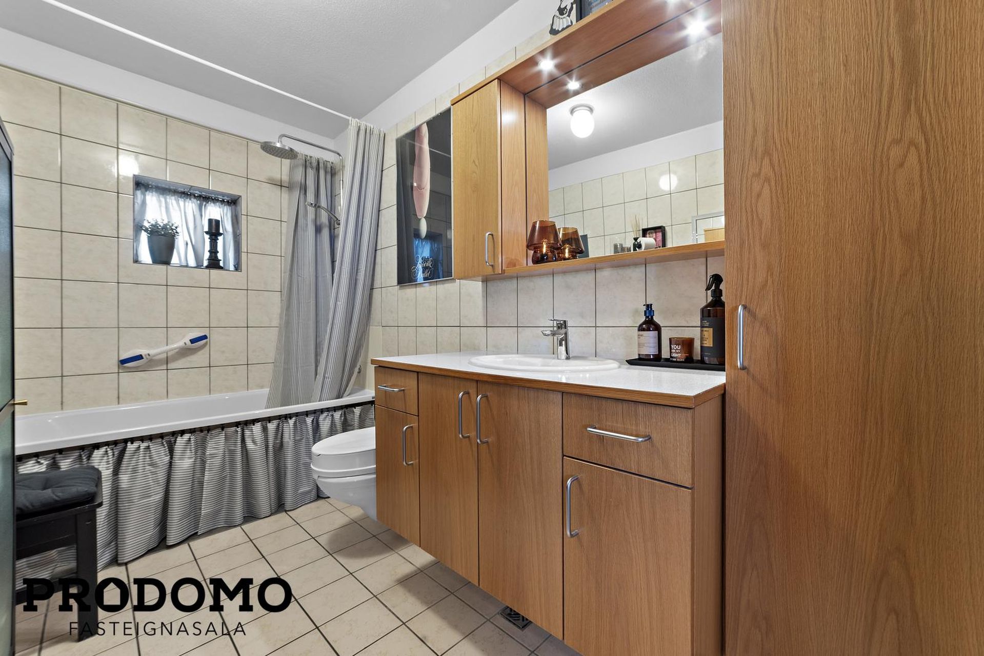 Baðherbergi með flísum á gólfi og veggjum. Stílhrein eikar innrétting og baðkar.