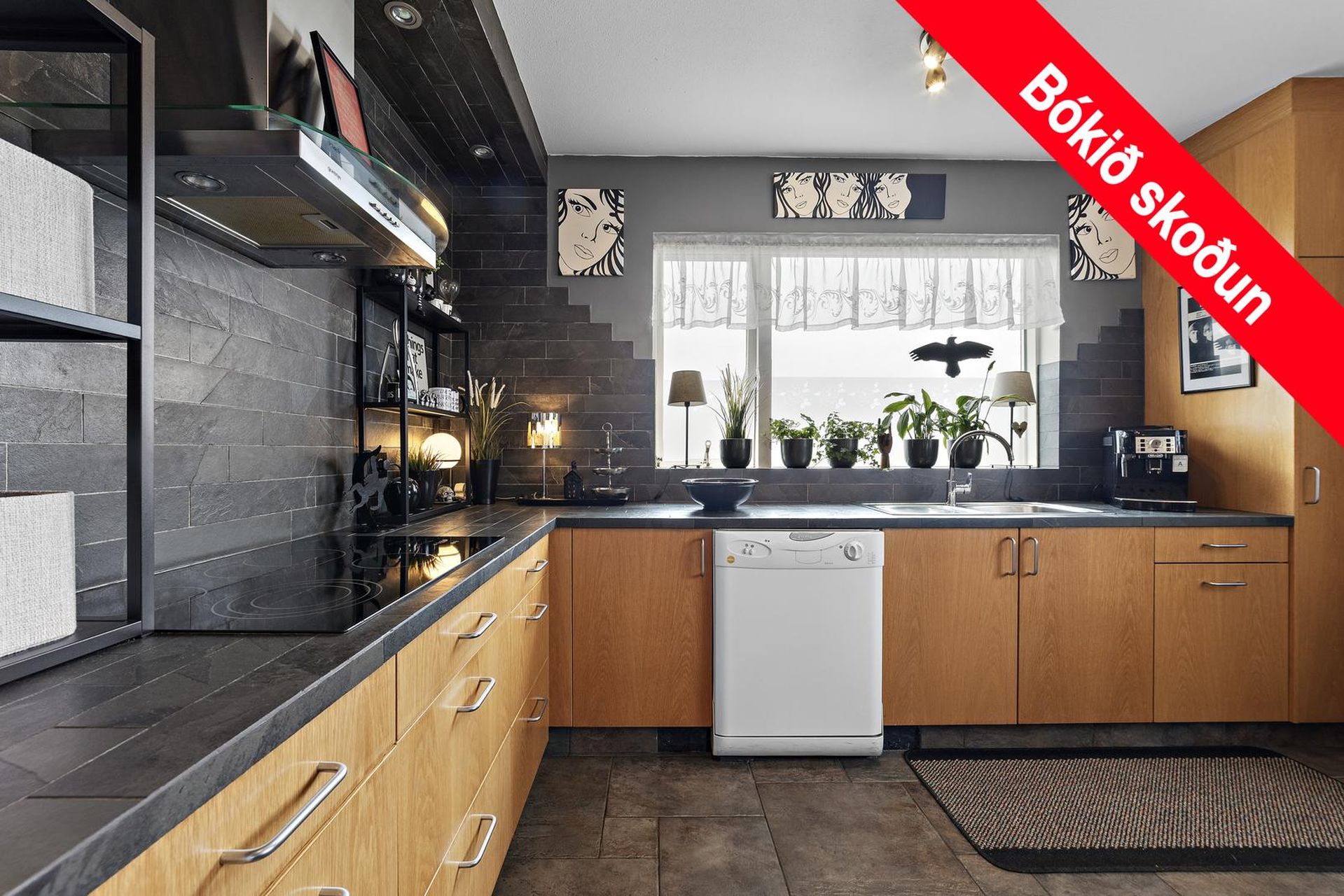 Eldhús með flísum á gólfi og fallegri eikar innréttingu. Helluborð með stálháf yfir. Gert er ráð fyrir uppþvottavél.